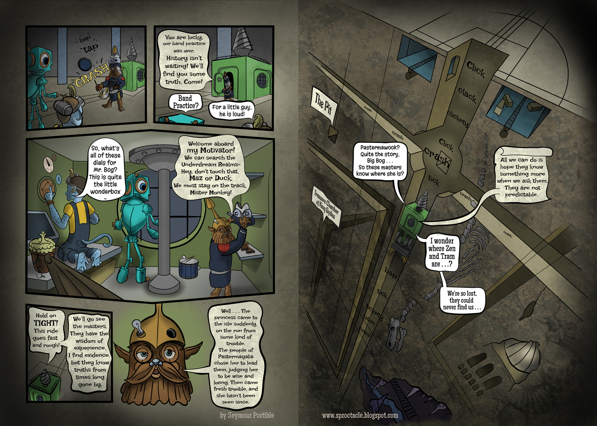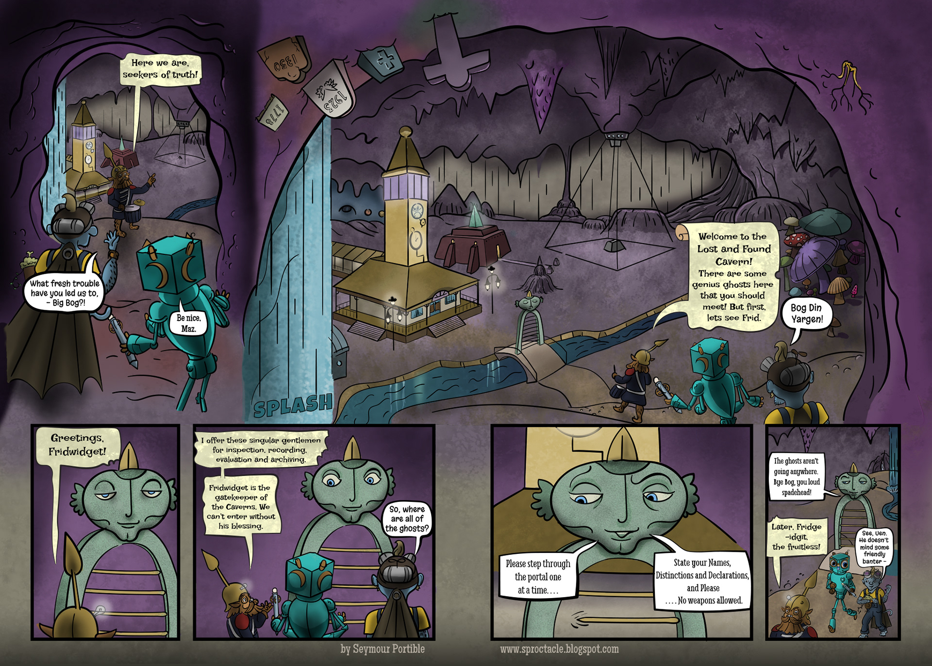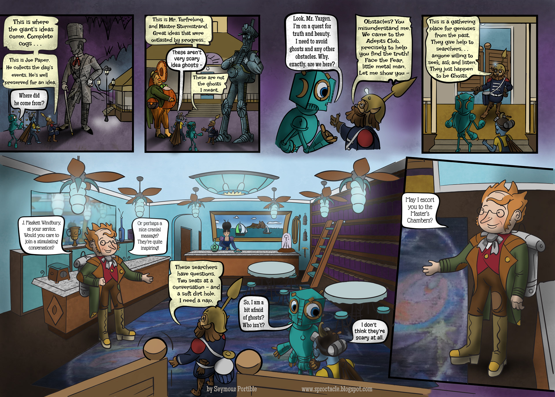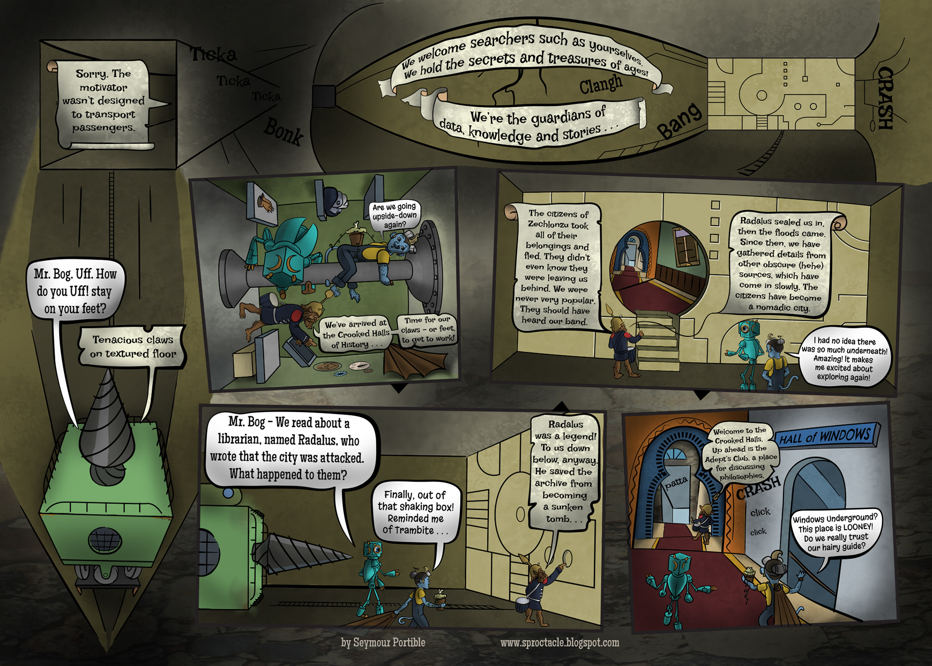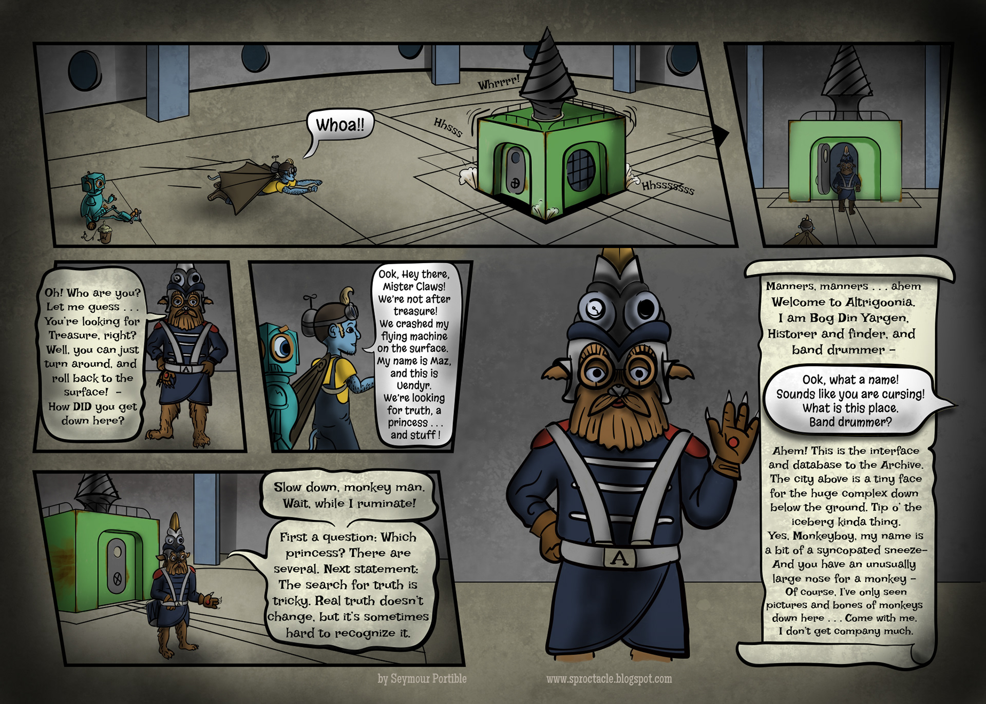 I've been busy lately, and a bit stumped about this page, so it has been a long time coming. It is simpler, but it includes this scroungy new character who I have been drawing for years, Bog Din Yargen. He's like a librarian and a miner and a rodent, all put together. Quite a contrast to the other characters . . .