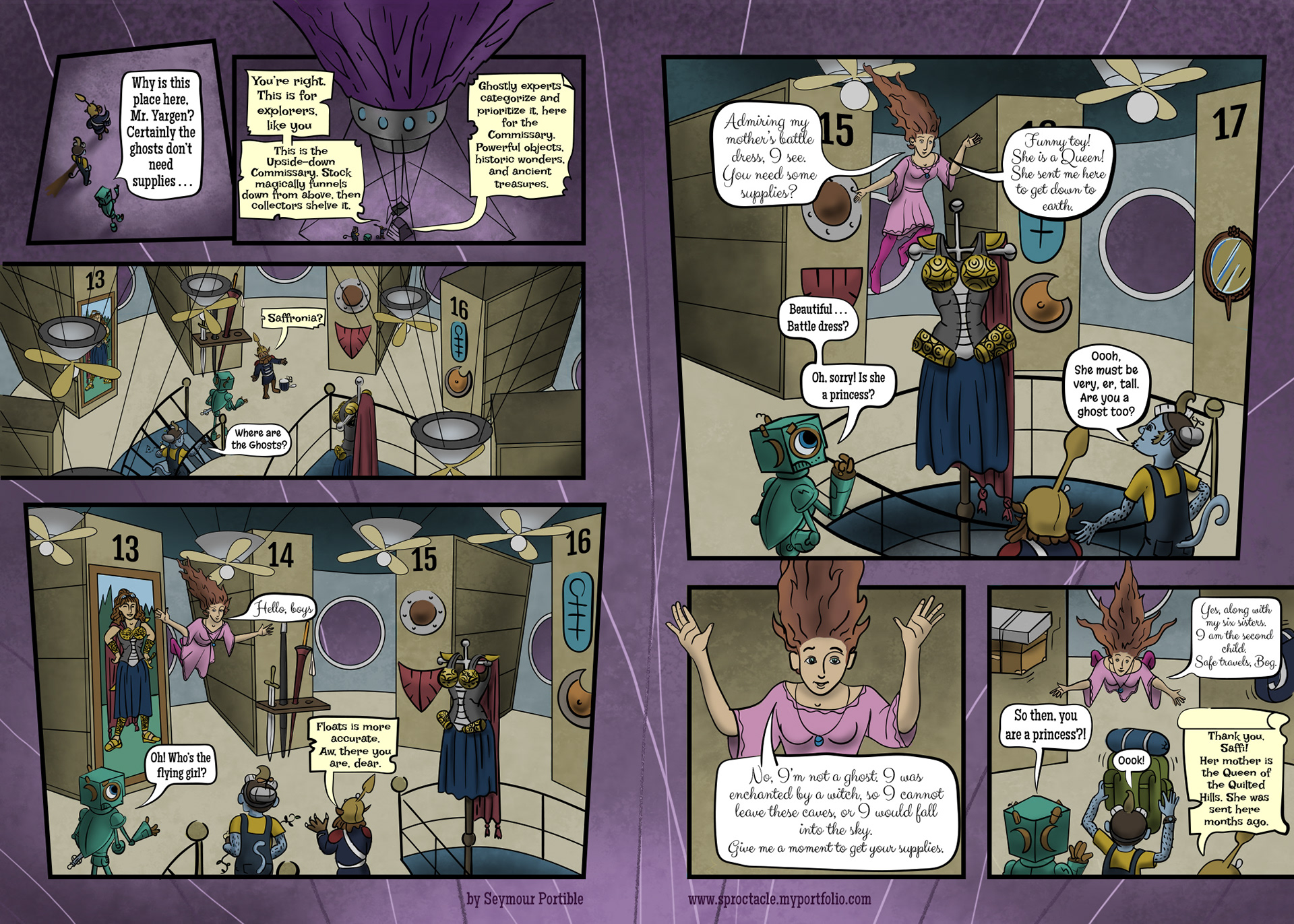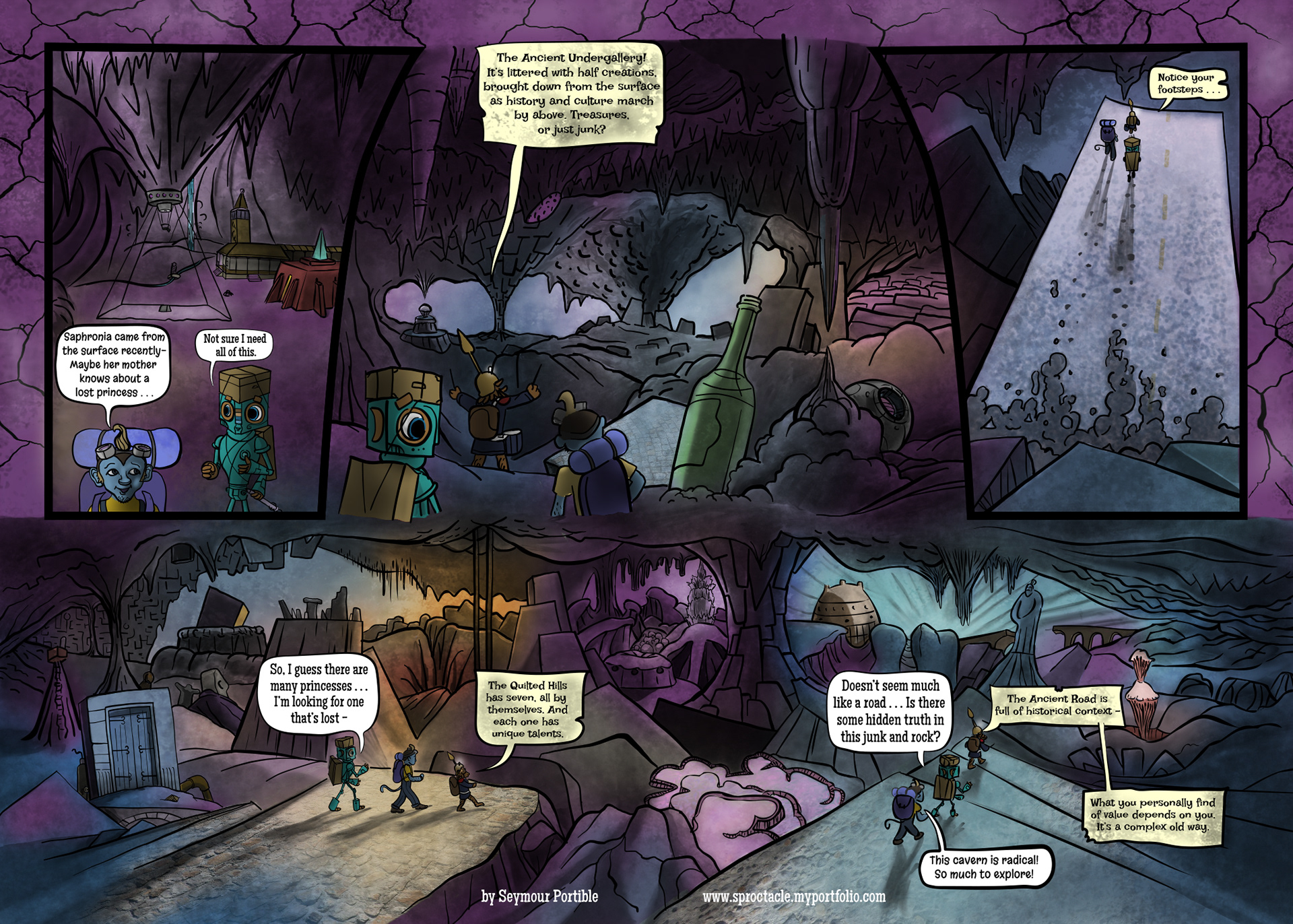 I enjoyed this one for the change of pace, color, a new character, a cool, open place to explore. Simple. This is a new place, maybe what you expect deep underground, but also very purple, and looking a bit lived in. This is about being honest with yourself, and your new acquaintances, when you are looking for information or advice. Also, making friends as needed.