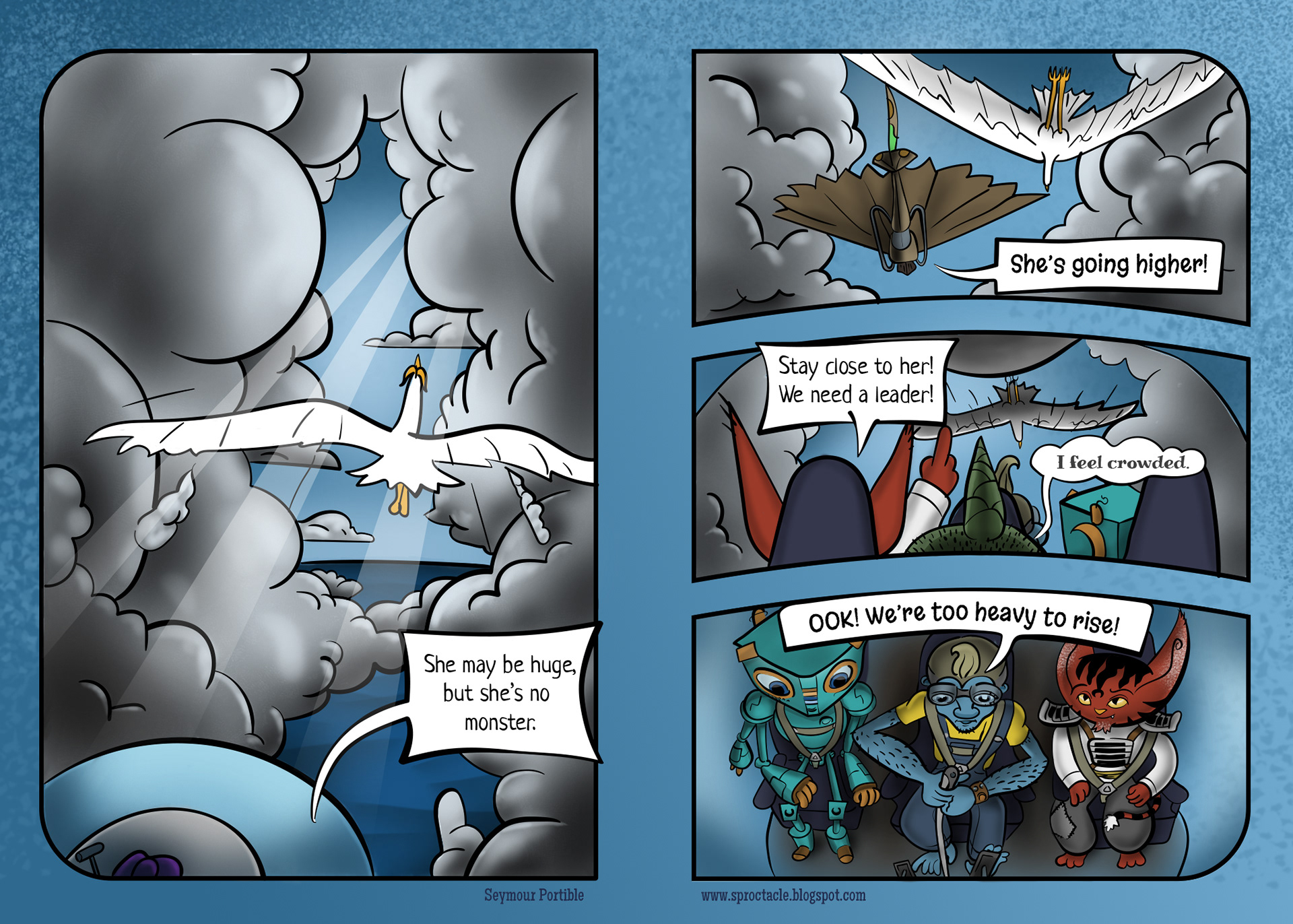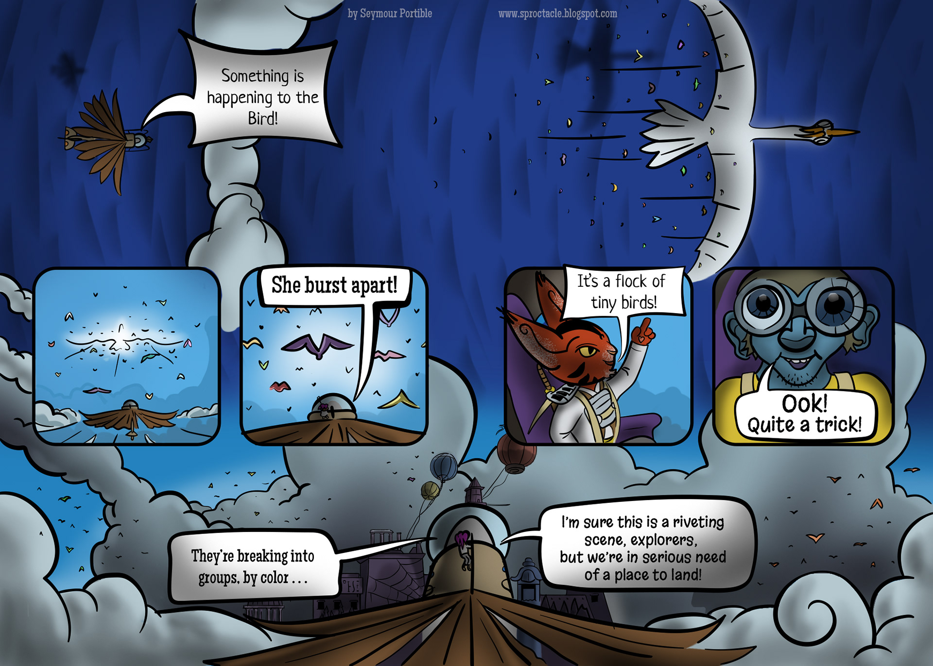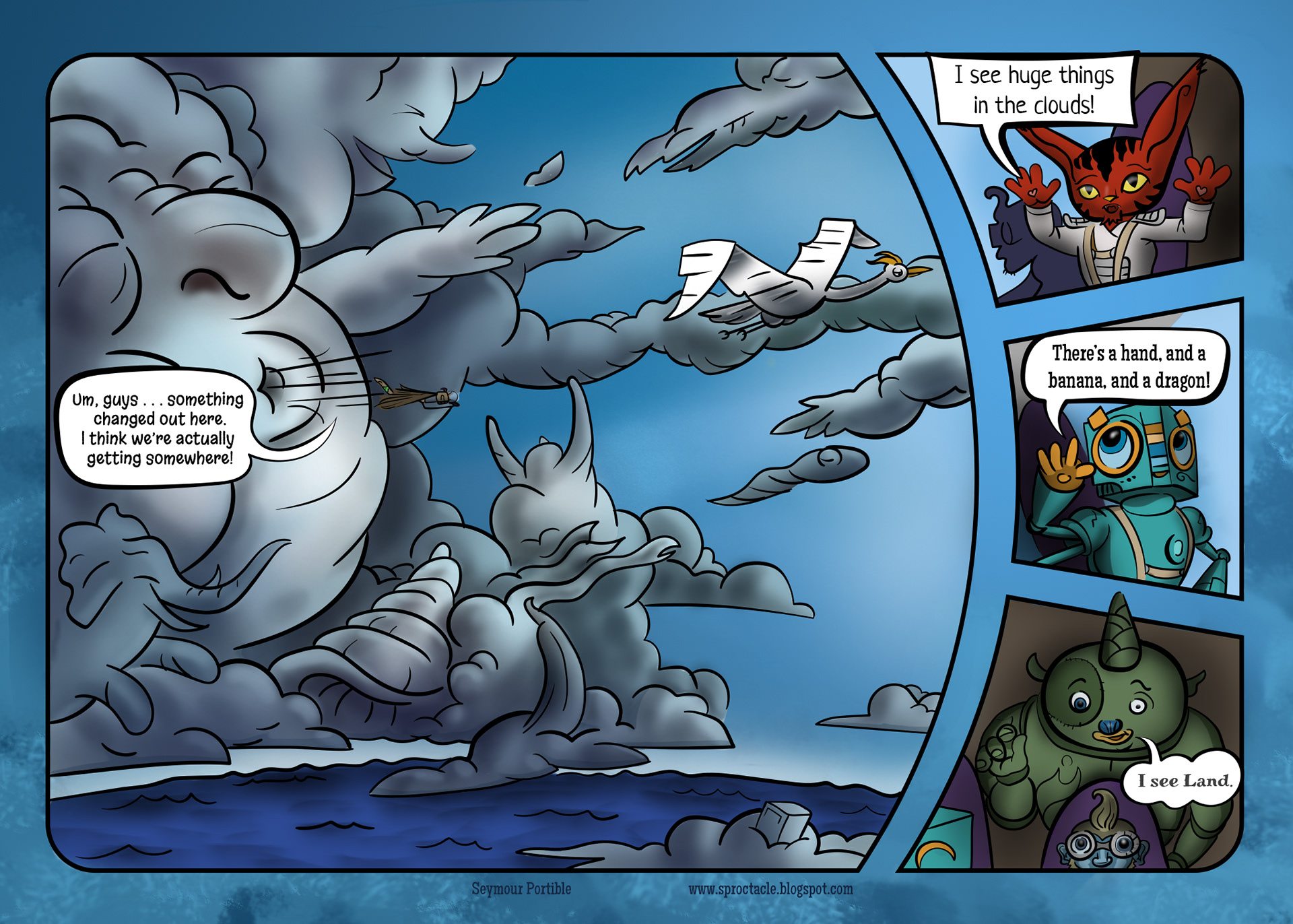 Leave it to Trambite, the one most comfortable in the sky, to notice something ahead, through the distractions. (He's the green guy that appears to have a single horn in his head).