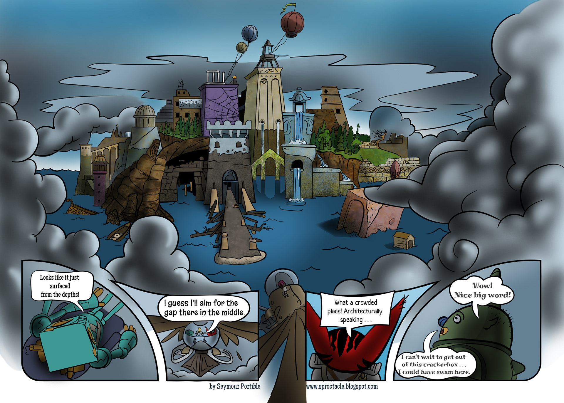The four (five counting the weird guy) adventurers have arrived at a mysterious, somewhat scary, but nevertheless welcome city, risen from the waves. Is it dramatic enough?