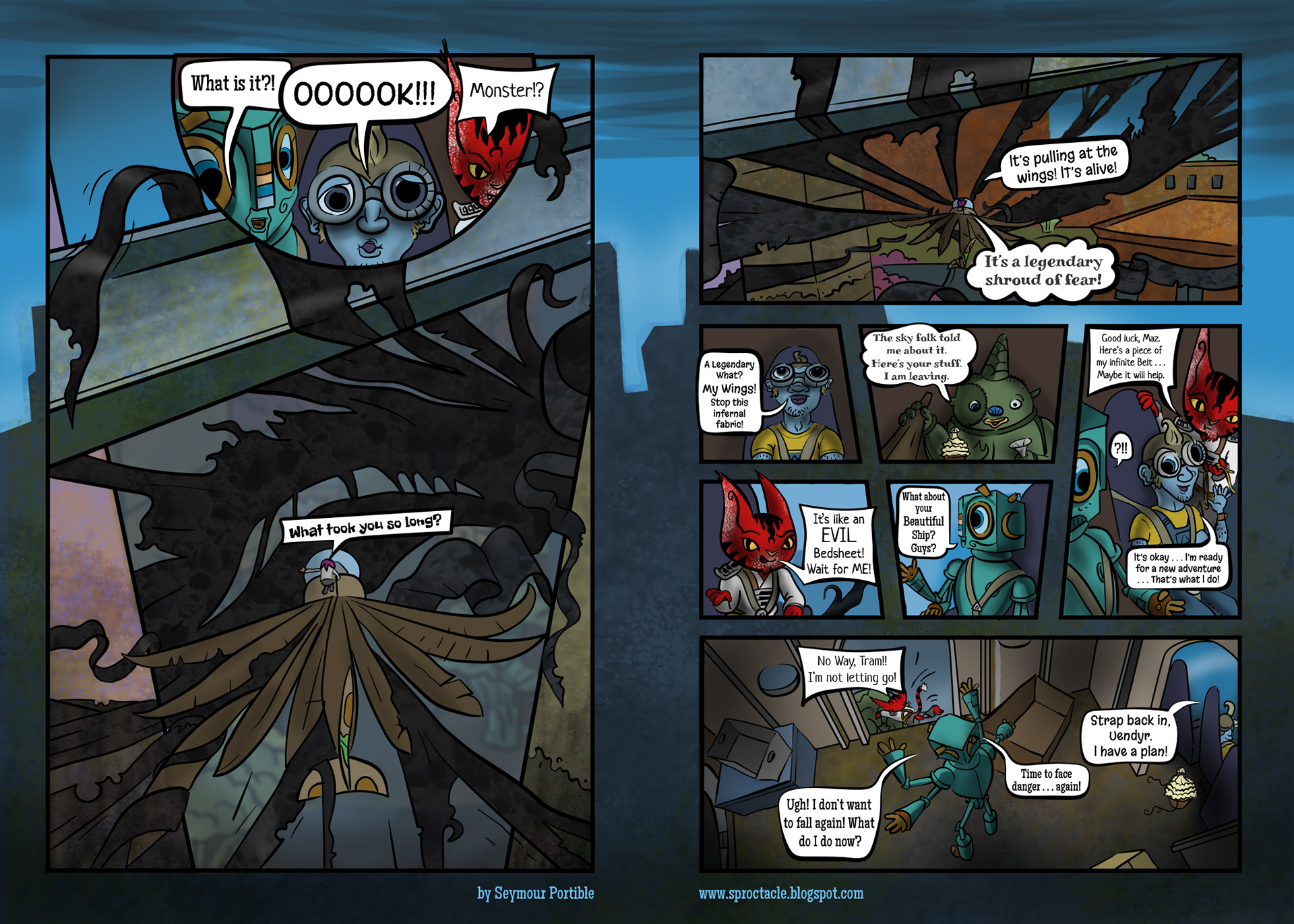 I know, this is a cliffhanger. Yes, that is a giant skeleton-robot, wearing the Shroud of Fear as a cape, who they apparently haven't seen yet. Lots of questions will now have to wait for resolution, as this is the last page of the chapter.