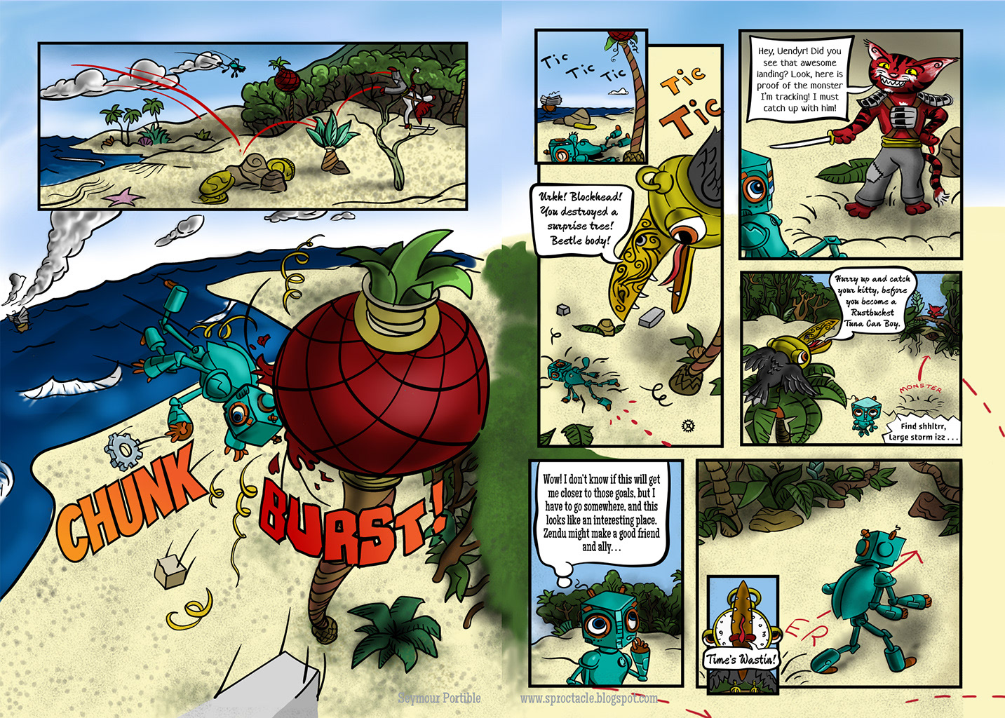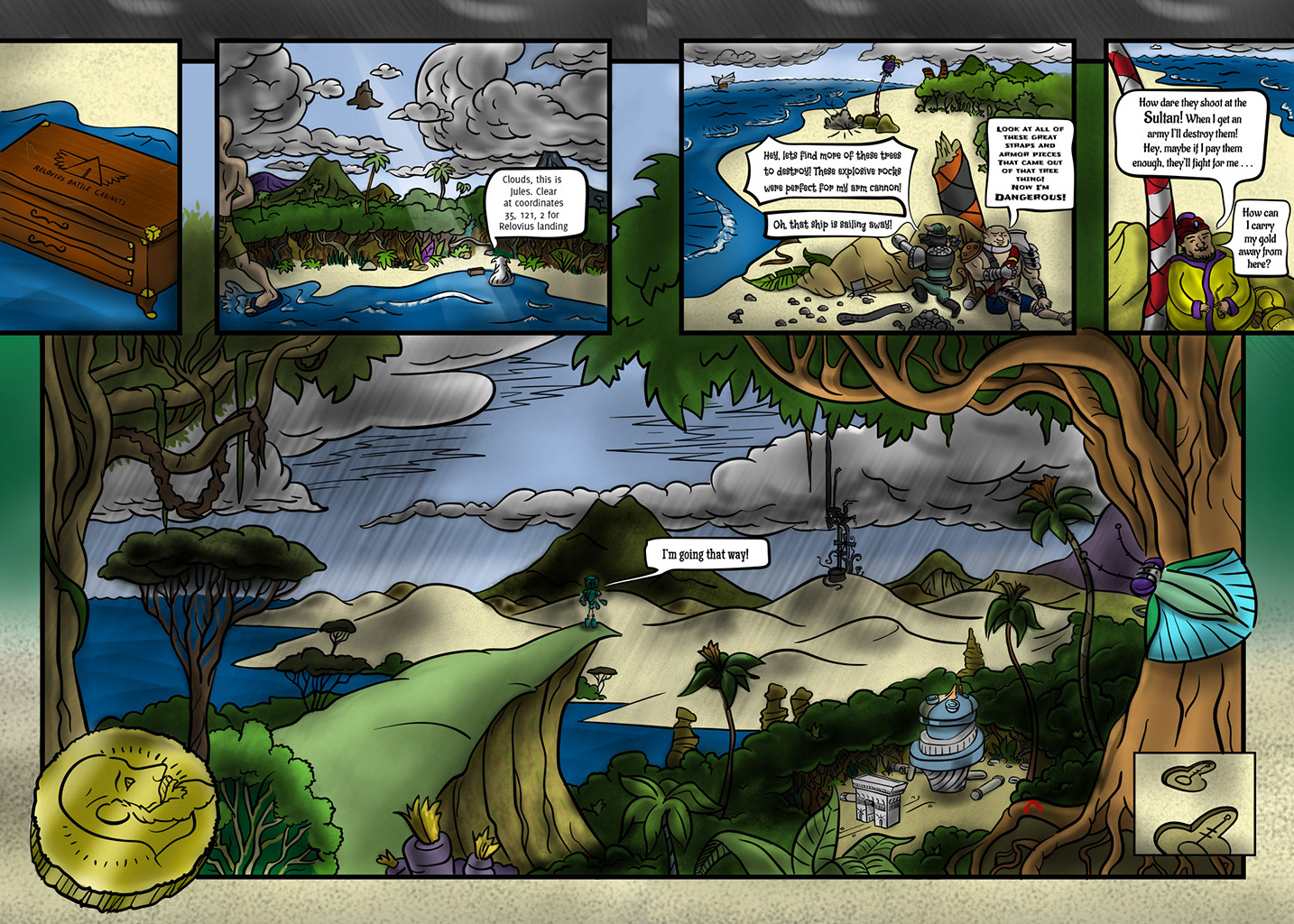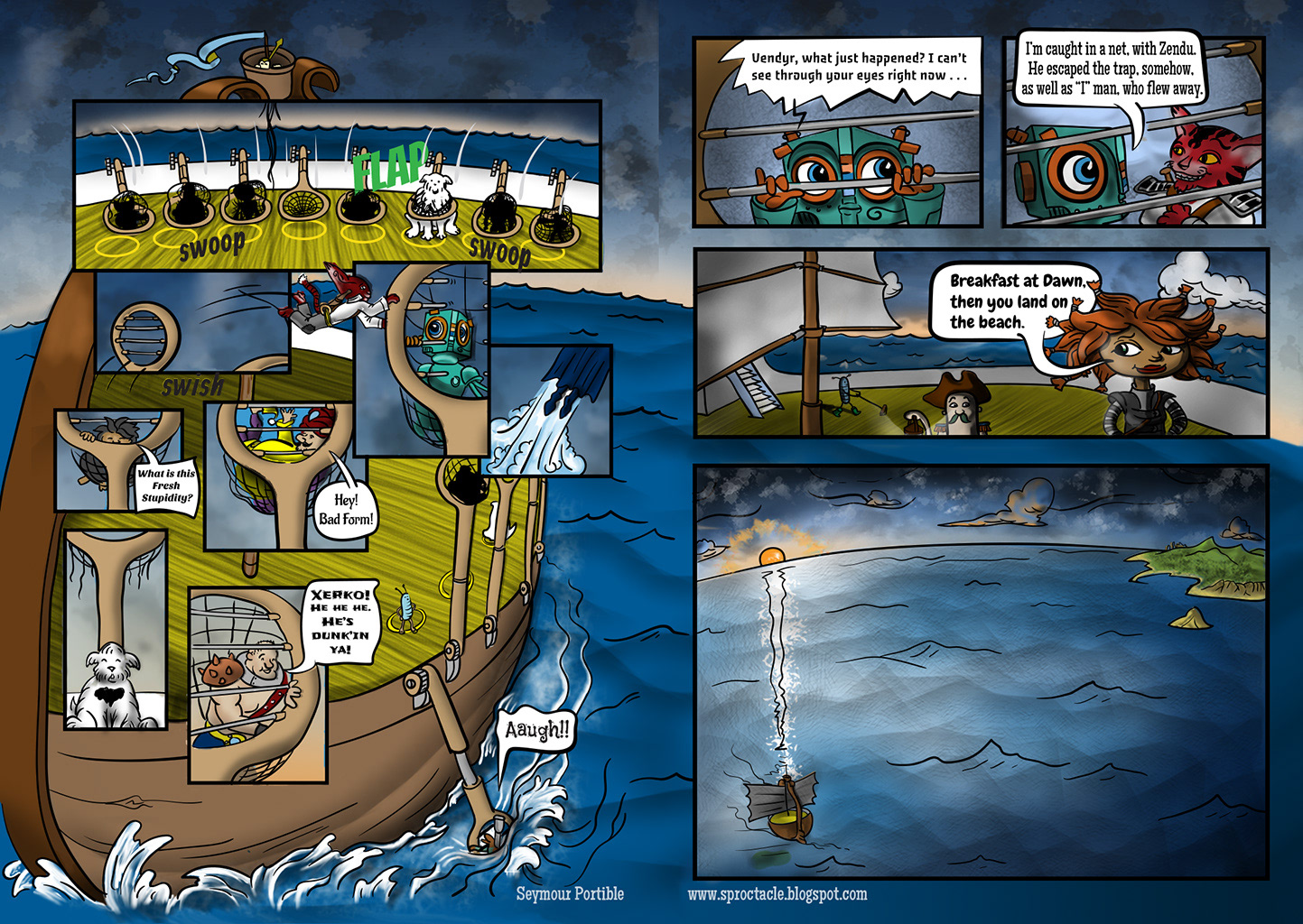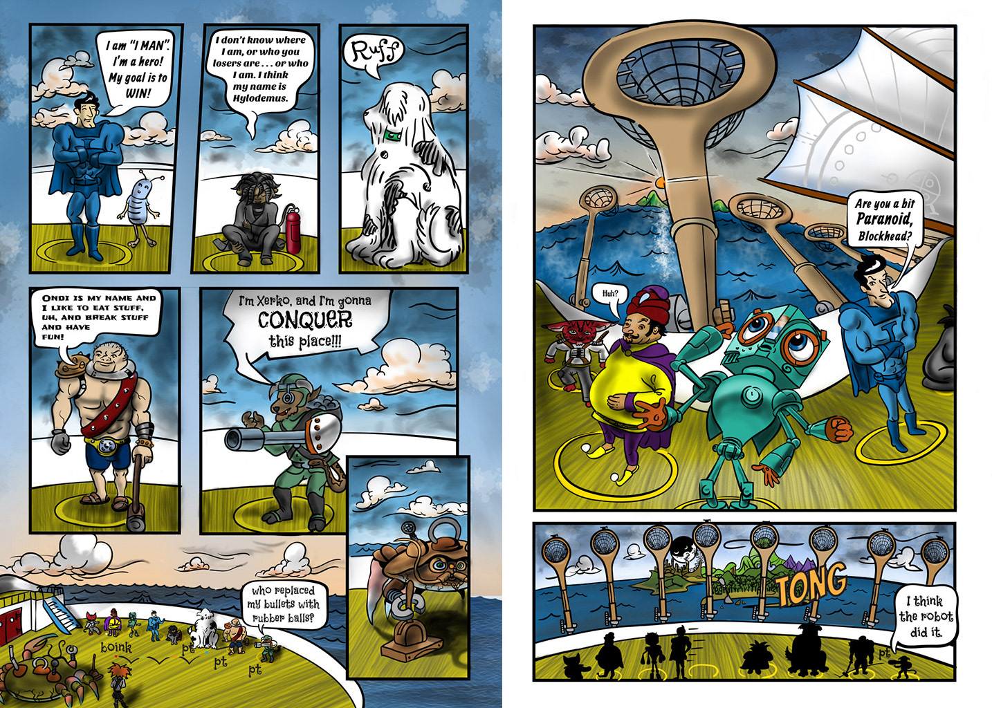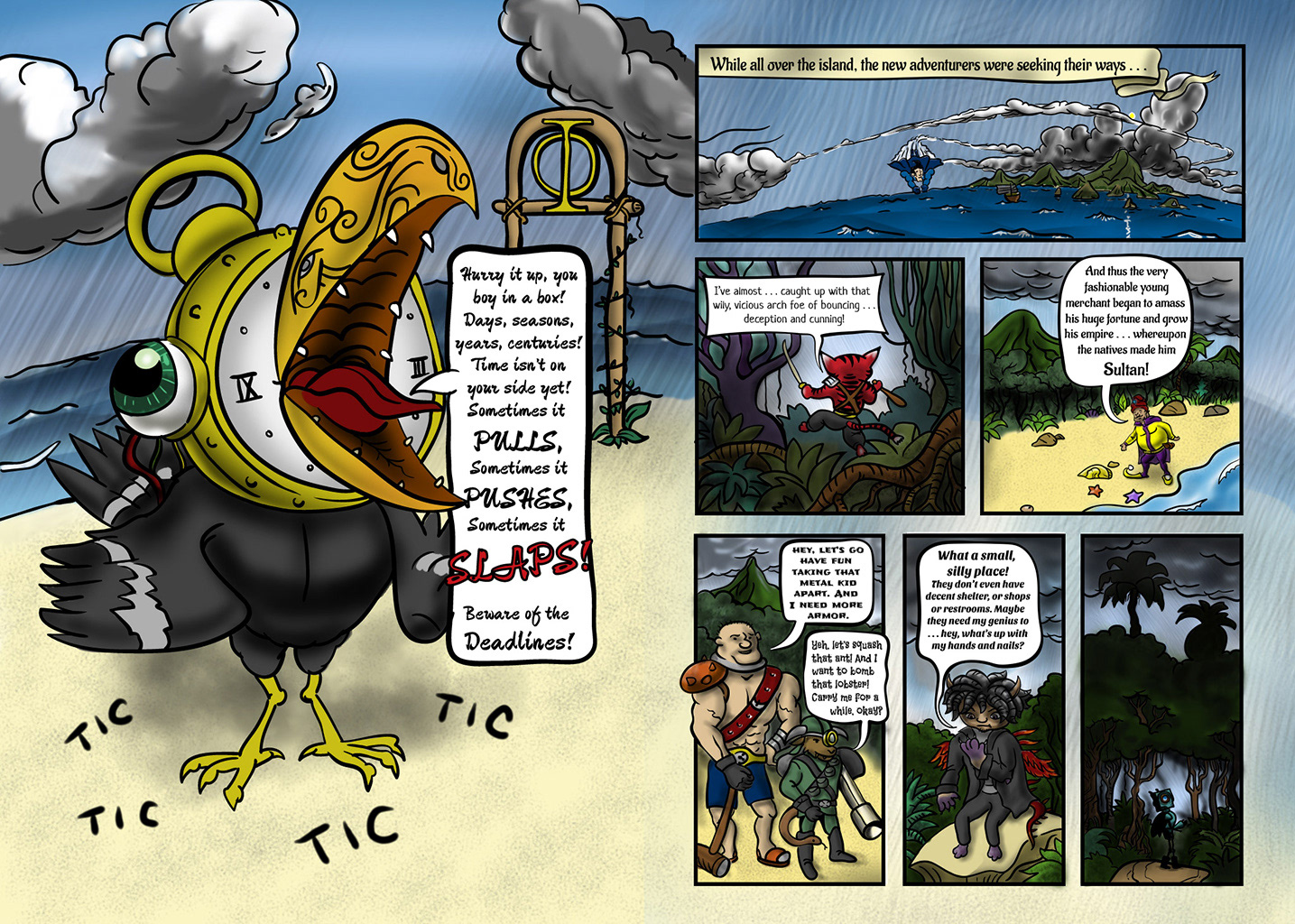 From the beginning I loved the idea of having a bunch of odd adventurers gather on the deck of a ship, and introduce themselves to a huge gold crab. The next page continues on this vein, if you are wondering. I have danced around lately, without landing on plot or characterization, but now it begins. Hope I can improve their communication skills though.