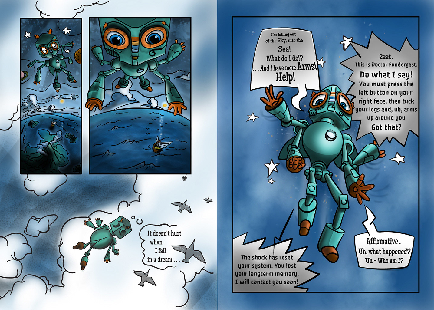 January, 2020. I replaced the main character with drawings of a real boy. Feels so much better. I found that these two pages were smaller, and therefore less resolution and quality. So this is a much needed upgrade, toward possible publishing. . .