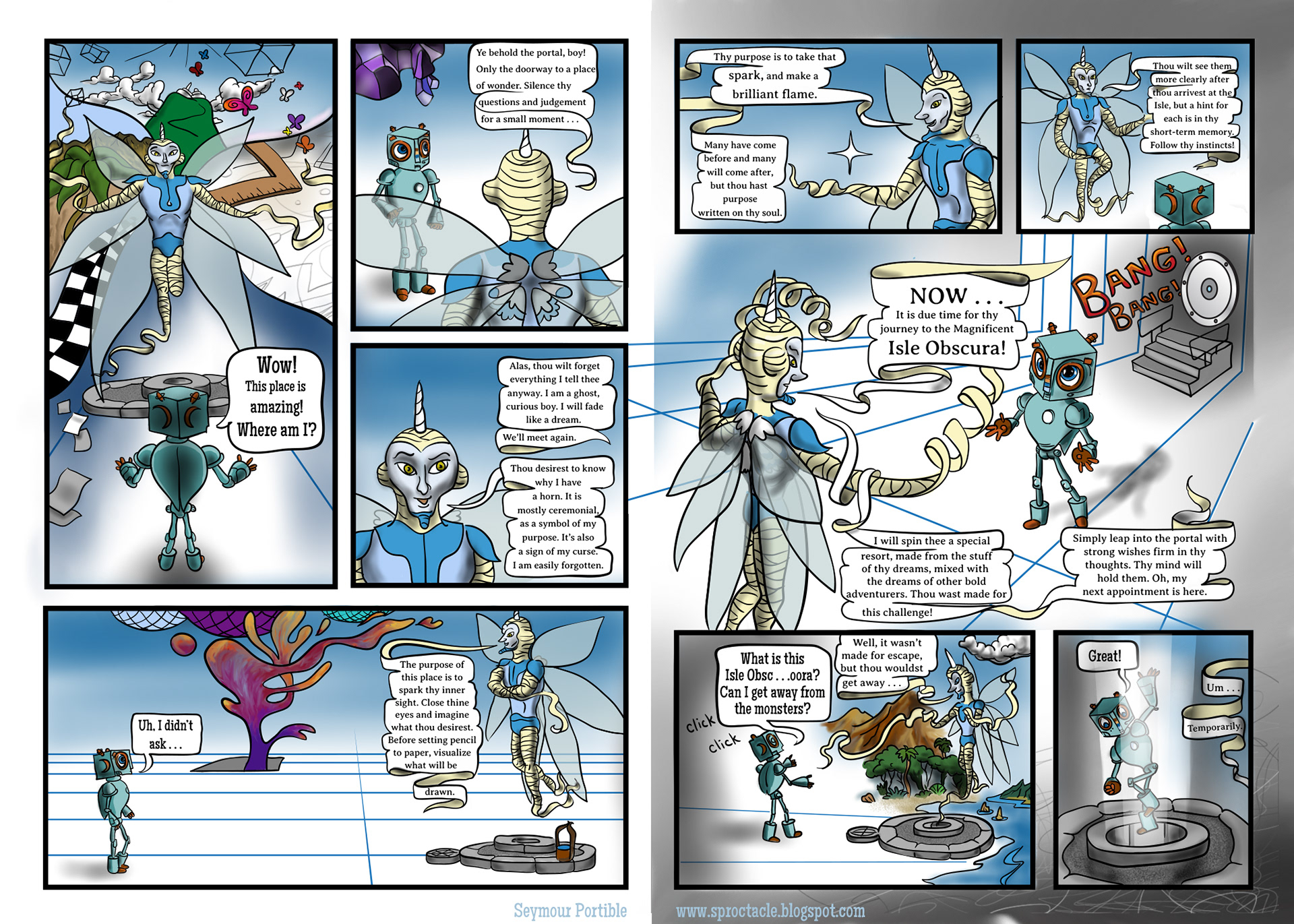 So, what is this spread about? Why does it matter what Radalus says, if Uendyr won’t remember? This is about making the decision to take the leap, even if you do it for the wrong reason. Radalus is just pointing out what a wonderful place the Isle is, and giving Uendyr confidence that he’ll be able to handle it. I realize your imagination doesn’t usually talk to you like a ghost, but vivid visions in your head are what starts your belief that there is potential ahead for something great. I started this online graphic novel because my imagination woke up every time I saw something cool. Then I made a leap by putting it on paper, and my “island” began to appear!