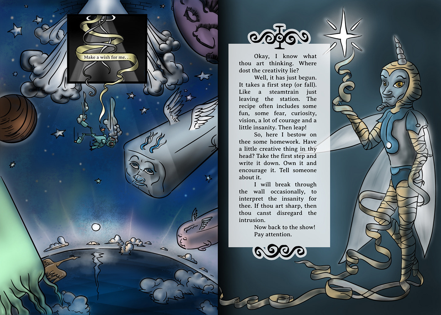 As you can tell, I am not quick to get to each creative point. I guess the story is more than just about creativity. The journey has to be fluid and unforced. There are better, faster ways to look at creativity, but it doesn’t work in a vacuum. So you can call the first 9 spreads the setup. (Including one cover, one title page, and a bonus cover).