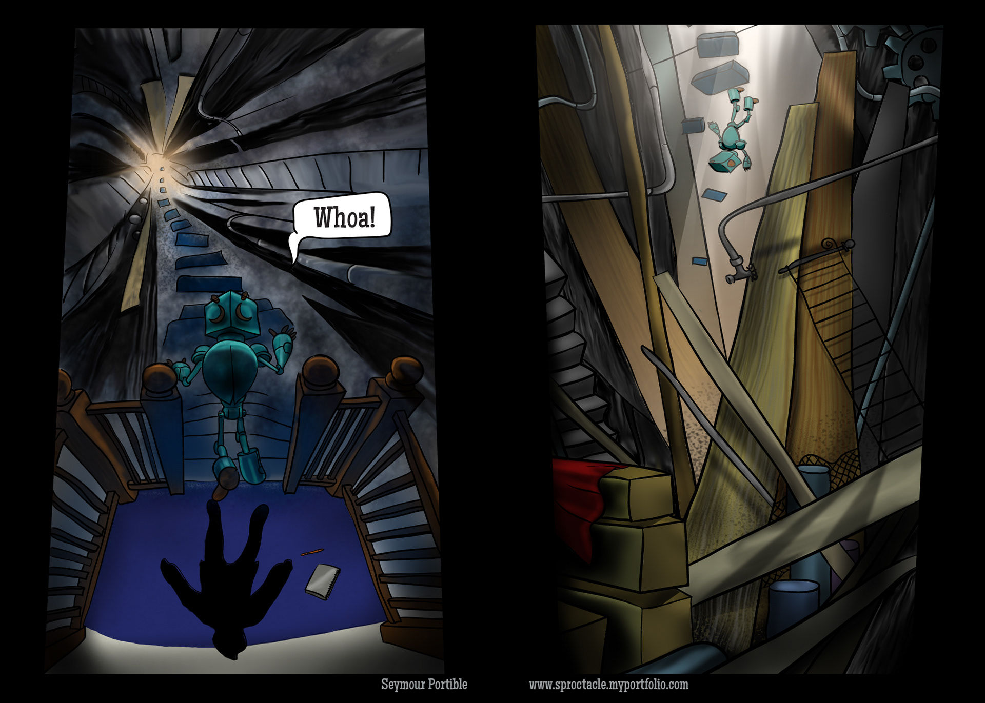I had many dreams of a space like this in my basement, more than 30 years ago, when I first started the story. There were hidden staircases, which got weirder as they led down. I’m just scratching the surface of possible things to express here, but I only have one page, and I have many more dreams to express. Also, I wanted to introduce perceived danger, just as my real dark basement used to have.