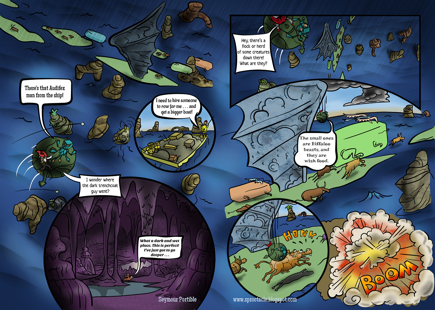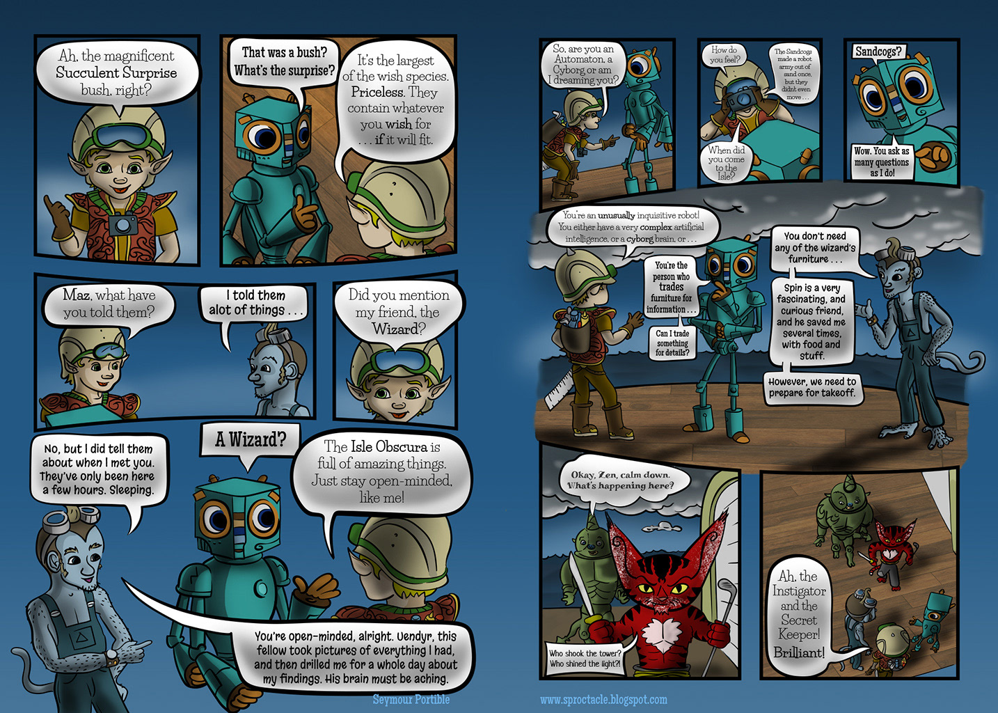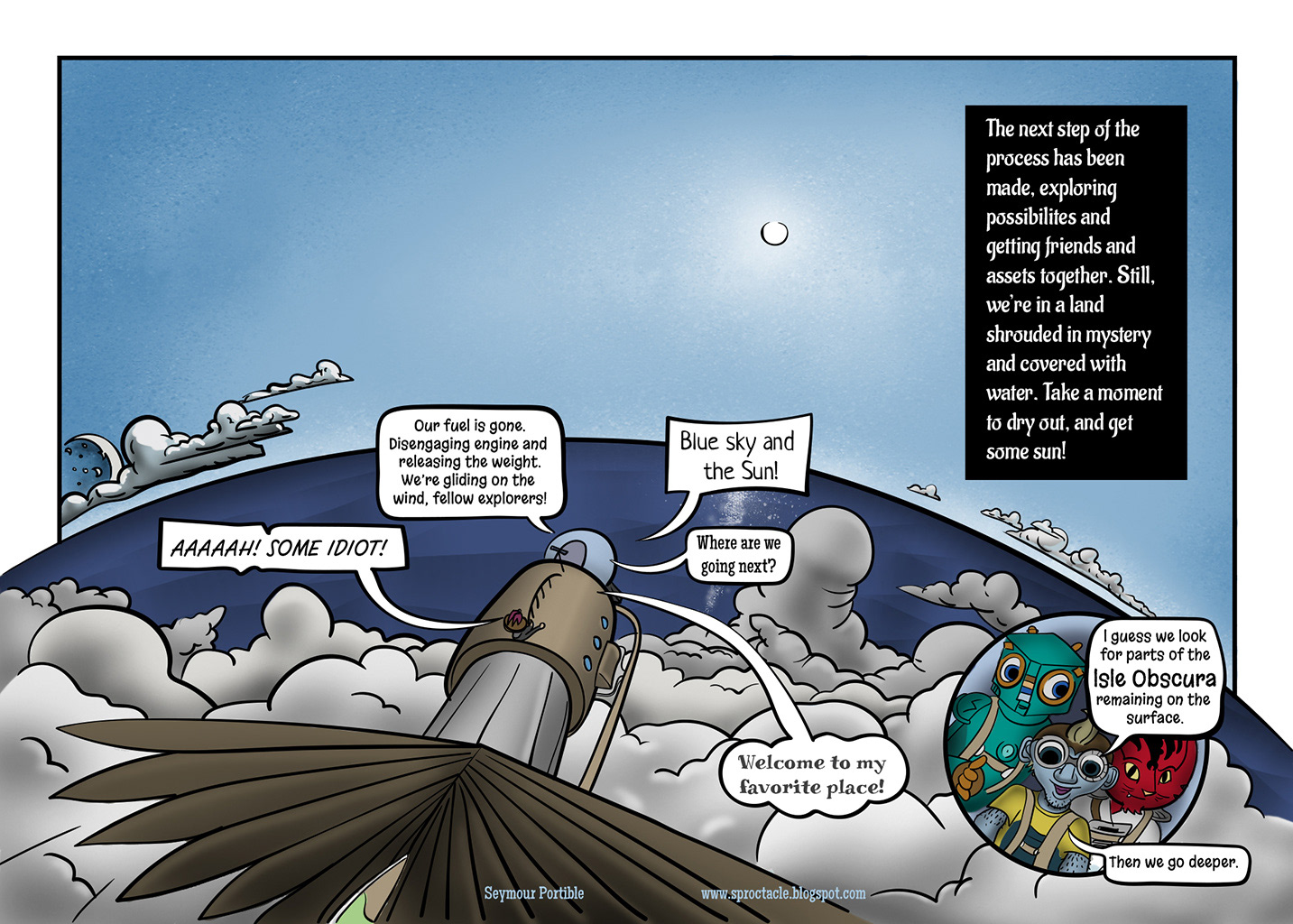 He also recently met another native, in a flying mansion, who apparently has some great furniture to trade. Who is that mysterious character, and what was he looking for? Where did he come from? Is there more island that hasn't sunk, where our travelers can go? The mystery builds as I reveal more of the plan behind this trip to the land of creativity, and the characters who drive it.