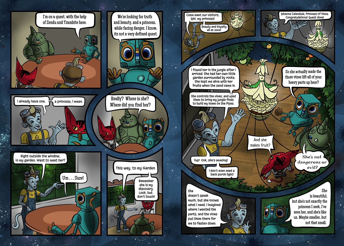 However, the experience of planning and drawing and coloring and lettering this book has been wonderful, and added a lot to my life. My children love it and often ask about it, or even contribute ideas to it, because the main characters are all based on them. I am the robot, and it suits me perfectly. I am always asking questions, and trying to understand the life that experience largely as an observer, like Uendyr. My wife humors me, without really being involved yet, until a character based on her appears in a later chapter.