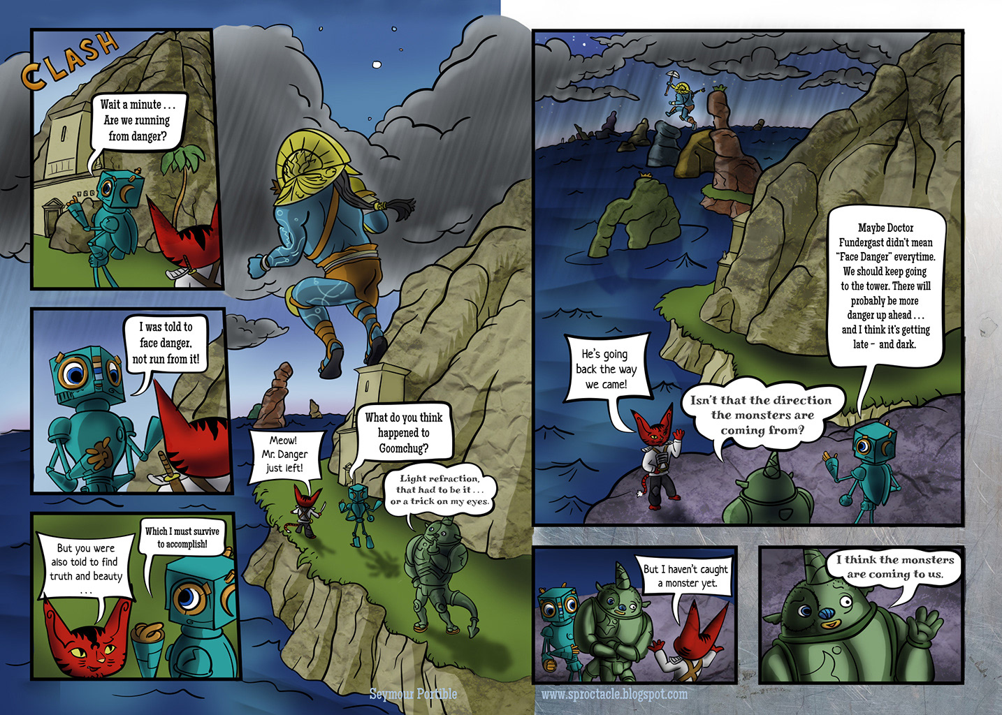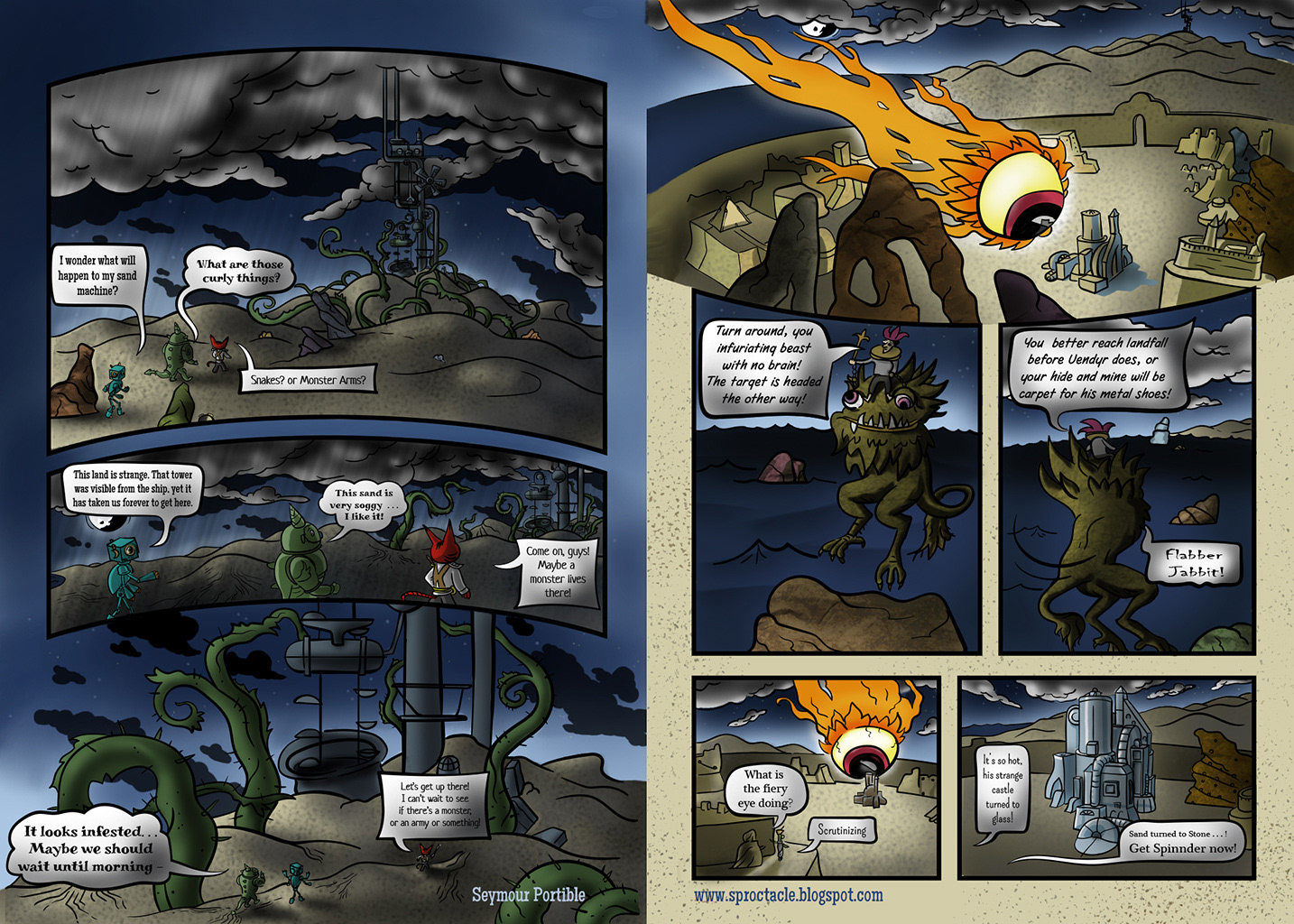 This one had a longer title, but it wouldn't fit: "The Soggy Sands and the Flaming Eye of Scrutiny". They have arrived at their destination, to find danger and confusion and darkness amid the soggy sands of a desert that isn't. As usual, Zendu wants to rush ahead and Trambite wants to hold them back. Lots of contrasts and surprises here, including thorned, huge, fast growing vines.