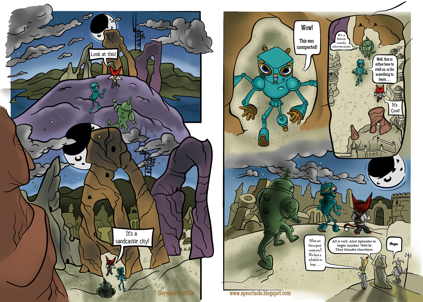 Leaving the Sea of Consciousness behind, our travelers get a chance to see the creative work of some mysterious, possibly small, civilization. It's getting dark, the moon is up and shadows are growing long. The most ephemeral of creations, these sculptures of sand could not have been here long. Uendyr thinks the sandcastles are a possible distraction or lesson, but their creators don't even have our travellers in mind.