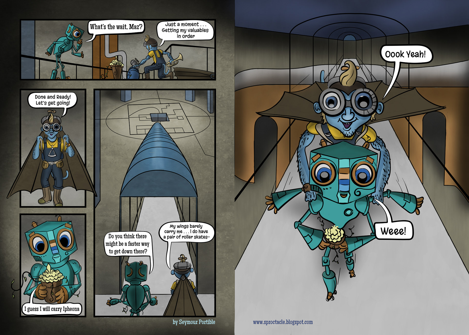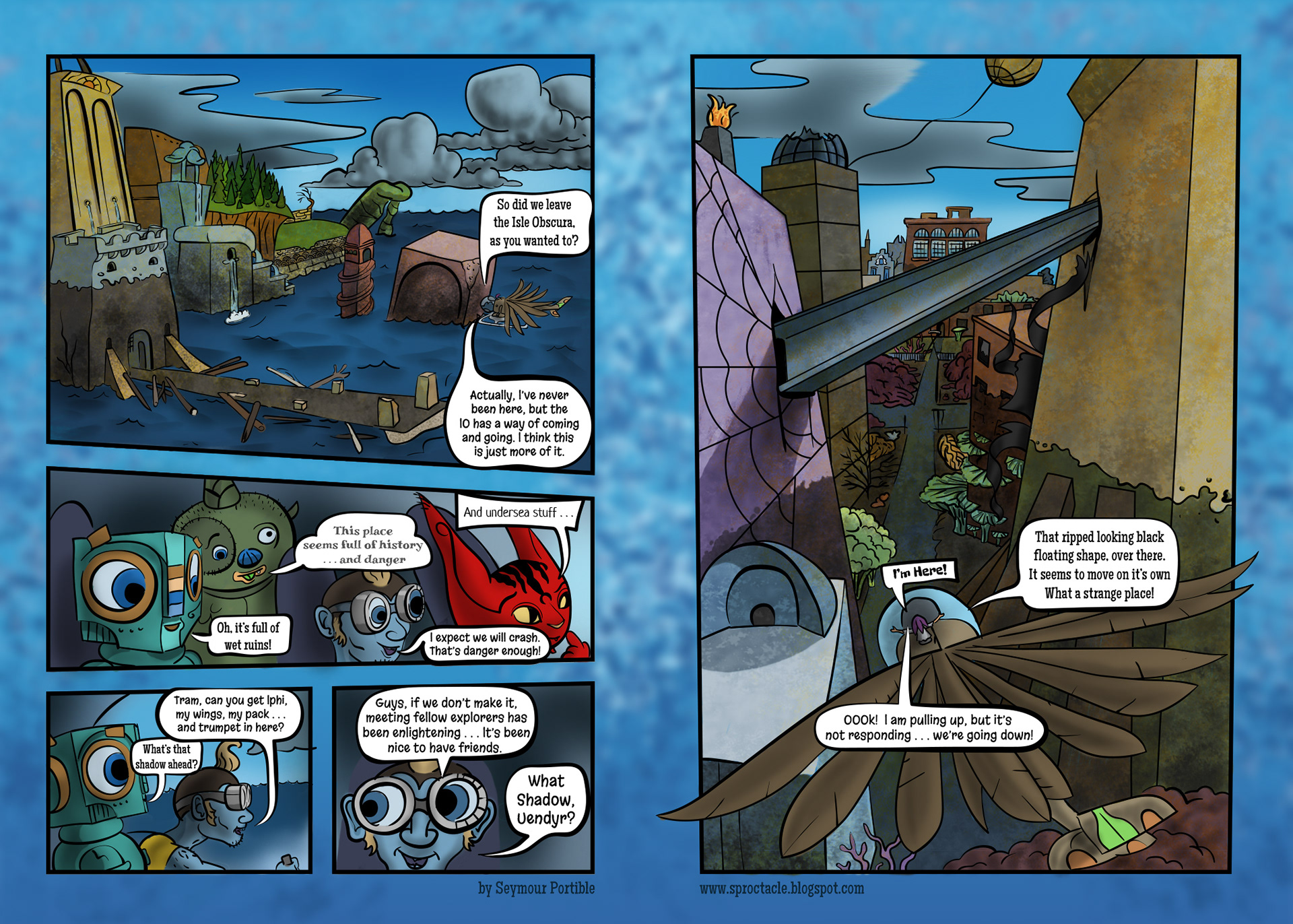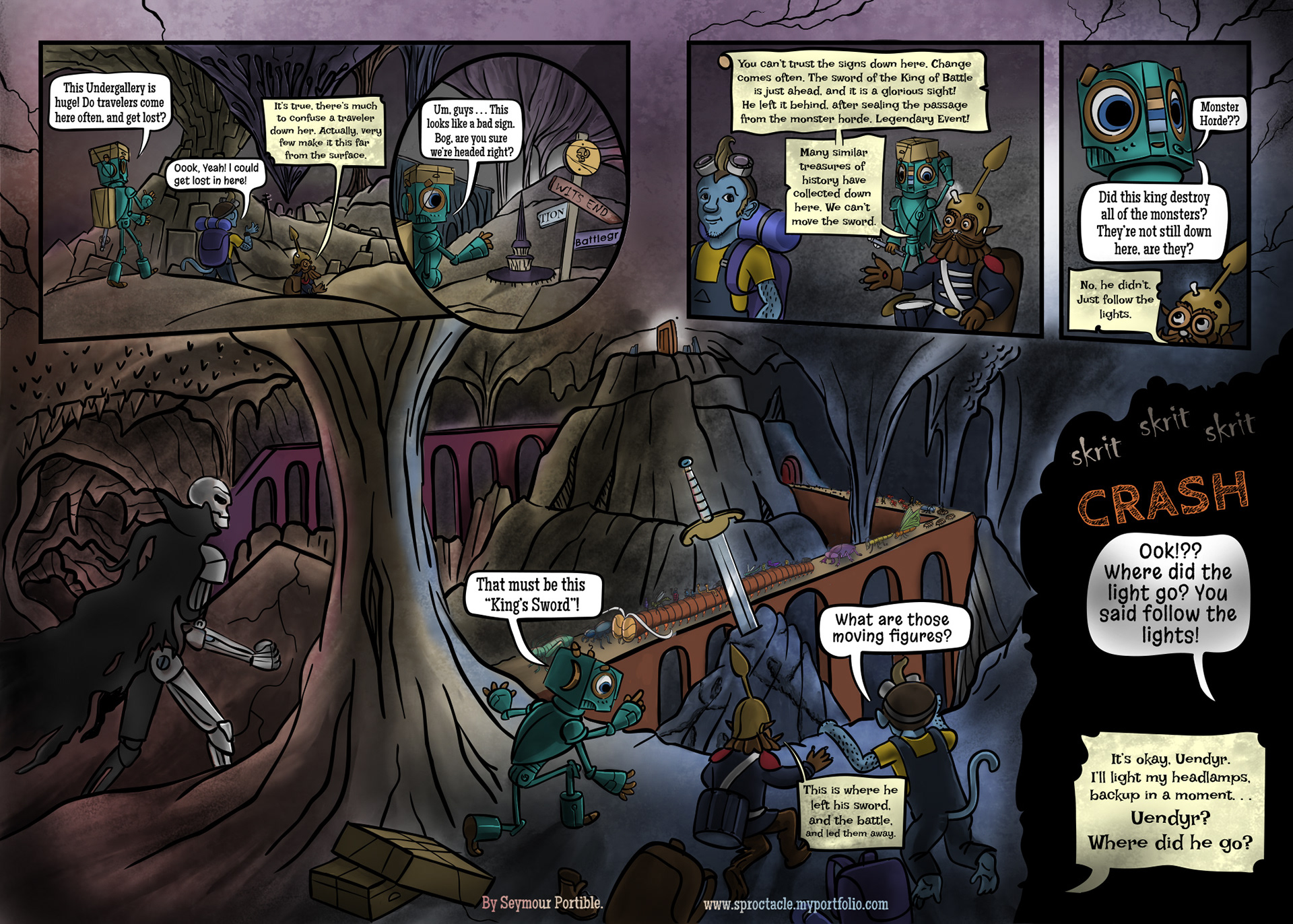 This is a sudden departure from the regular straight pages. Reminds me of how a trip is sometimes a jarring change from my regular life, and makes me stand back and see myself from a different point of view. This was a fun one to design with Uendyr and Maz being tossed around while Bog stands calmly driving.