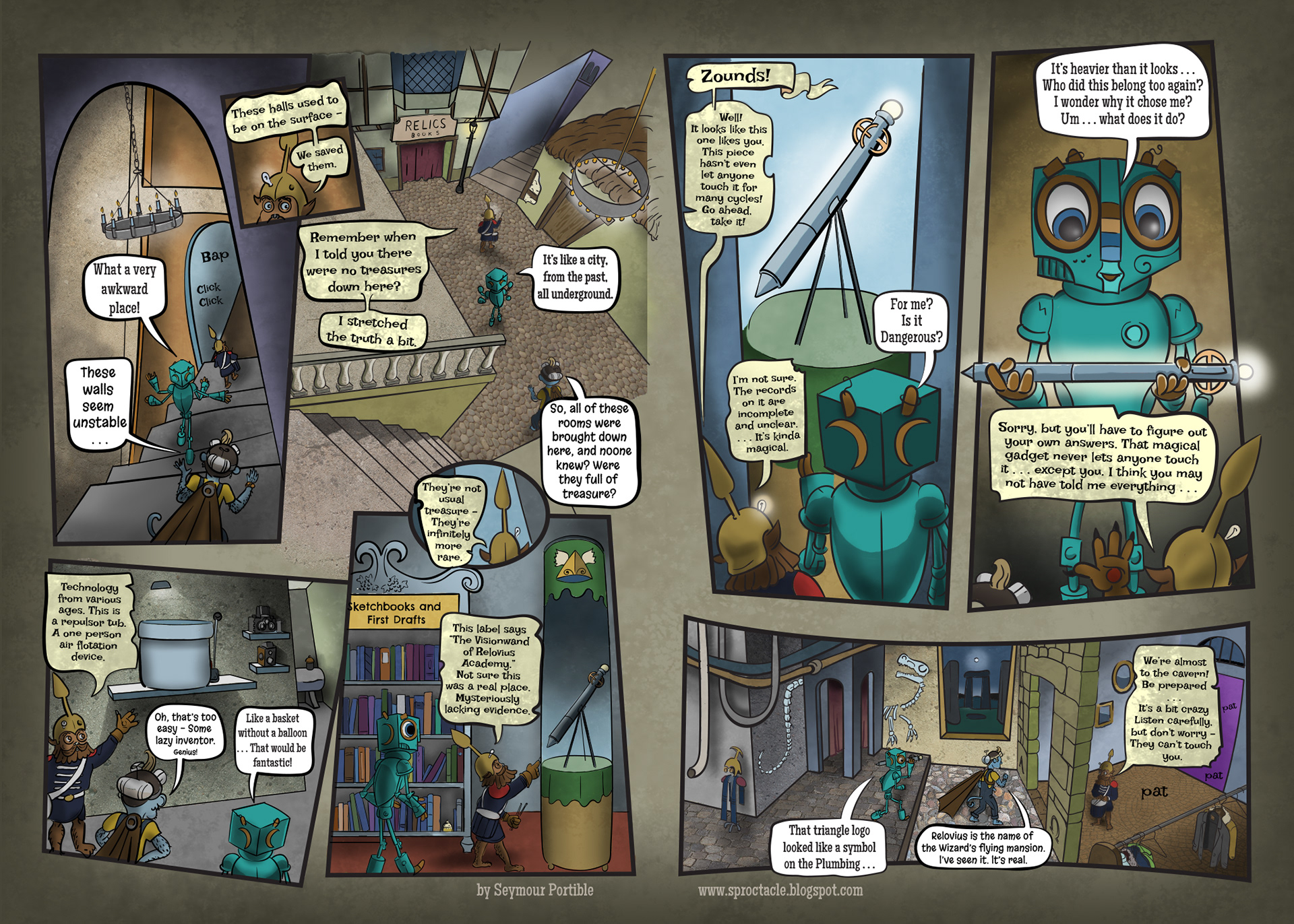 I've been busy lately, and a bit stumped about this page, so it has been a long time coming. It is simpler, but it includes this scroungy new character who I have been drawing for years, Bog Din Yargen. He's like a librarian and a miner and a rodent, all put together. Quite a contrast to the other characters . . .