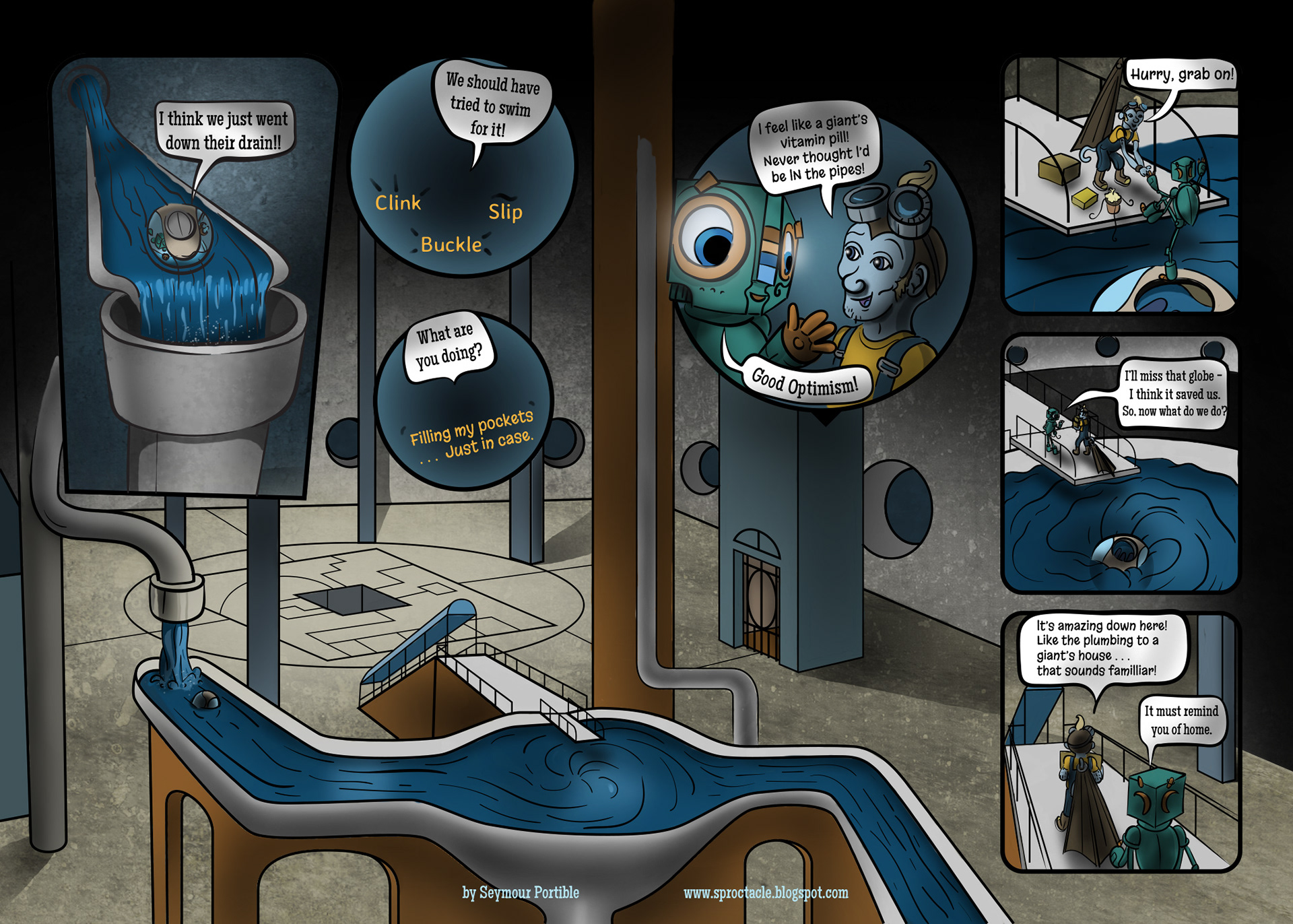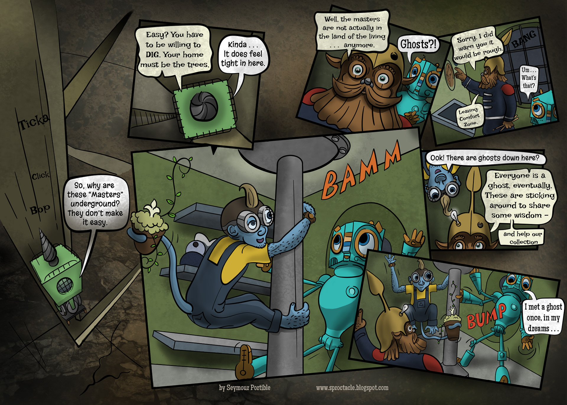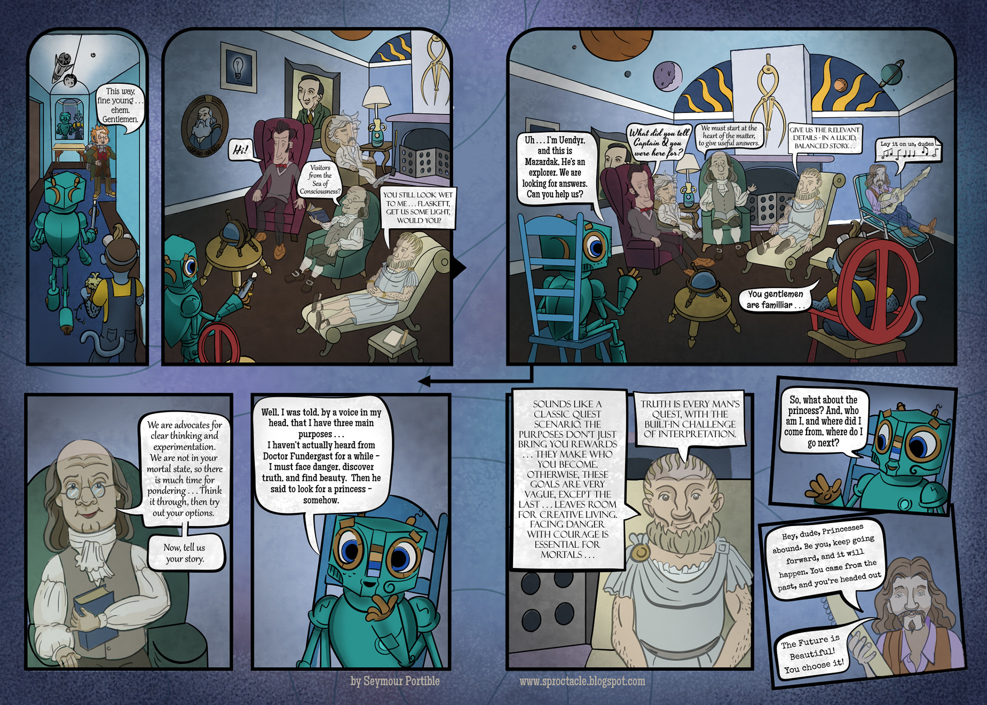 I have enjoyed making this graphic novel immensely, but it seems that I am too busy to get quick progress on it, and there is so much more to tell. I hope to get the whole thing to this point on a website soon, if I can find time. Then it will be easier to read and understand . . . maybe.