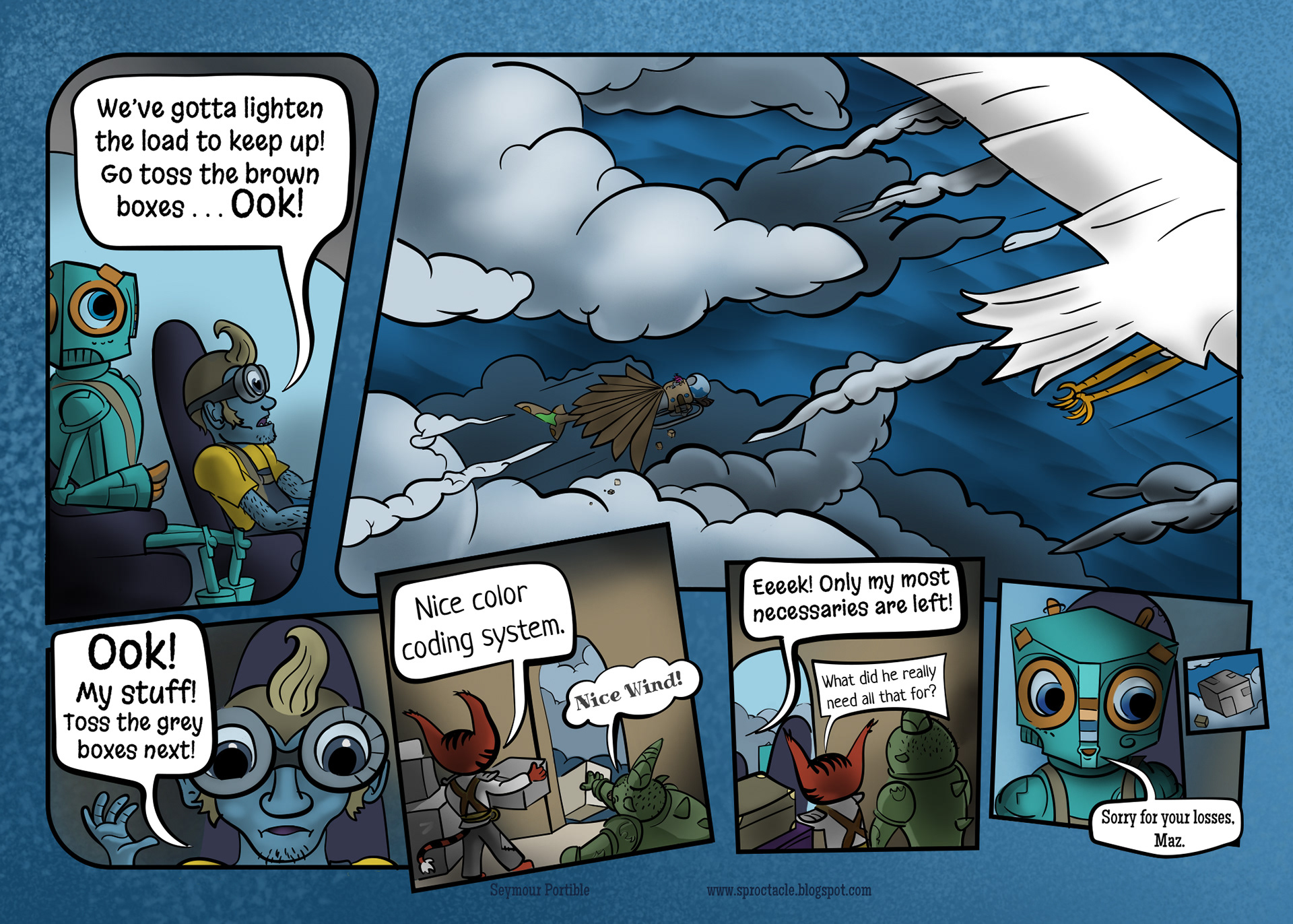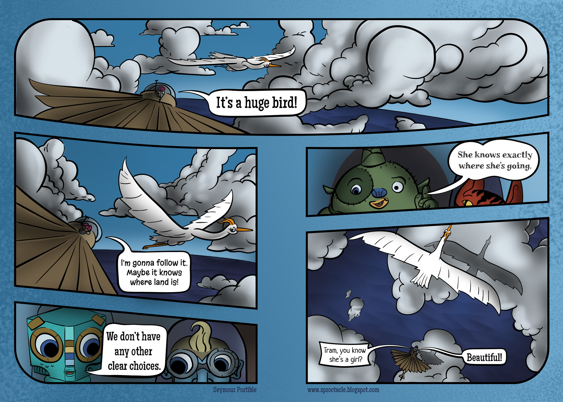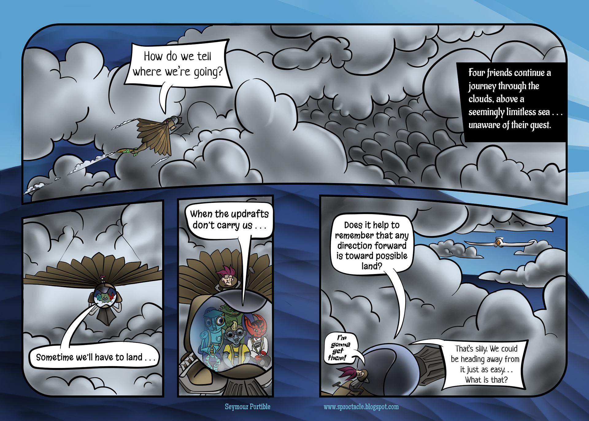 Leave it to Trambite, the one most comfortable in the sky, to notice something ahead, through the distractions. (He's the green guy that appears to have a single horn in his head).