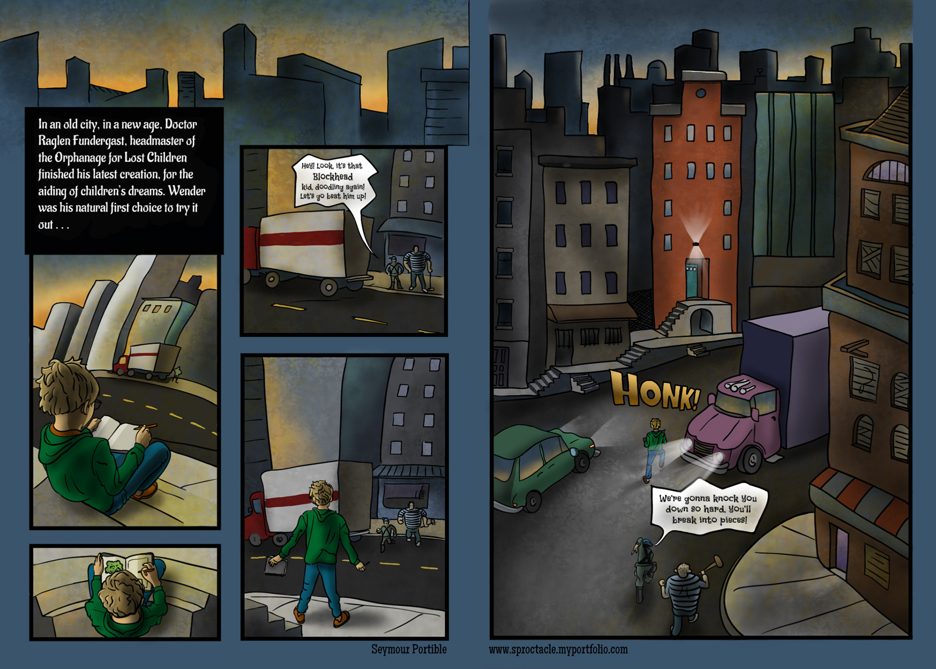 Blogpost 2011: The first page finally made today! And the actual story begins. I have anguished over the beginning more than any other part, largely because I didn’t feel like I knew how to portray Wender’s real waking life. I debated taking photos for this part, since I wanted a strong contrast with what happens later. I decided to express the change in colors and textures and darkness instead.