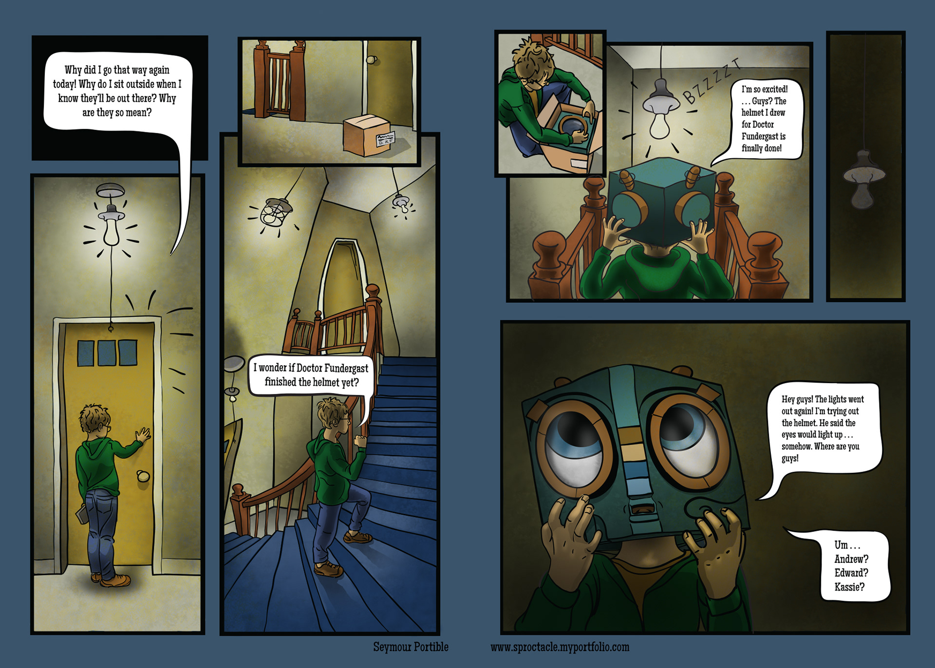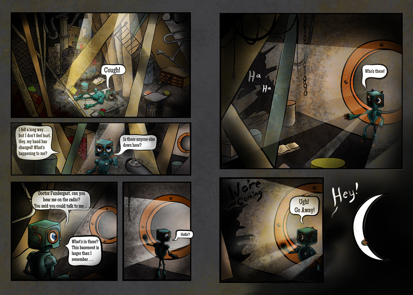 I had many dreams of a space like this in my basement, more than 30 years ago, when I first started the story. There were hidden staircases, which got weirder as they led down. I’m just scratching the surface of possible things to express here, but I only have one page, and I have many more dreams to express. Also, I wanted to introduce perceived danger, just as my real dark basement used to have.