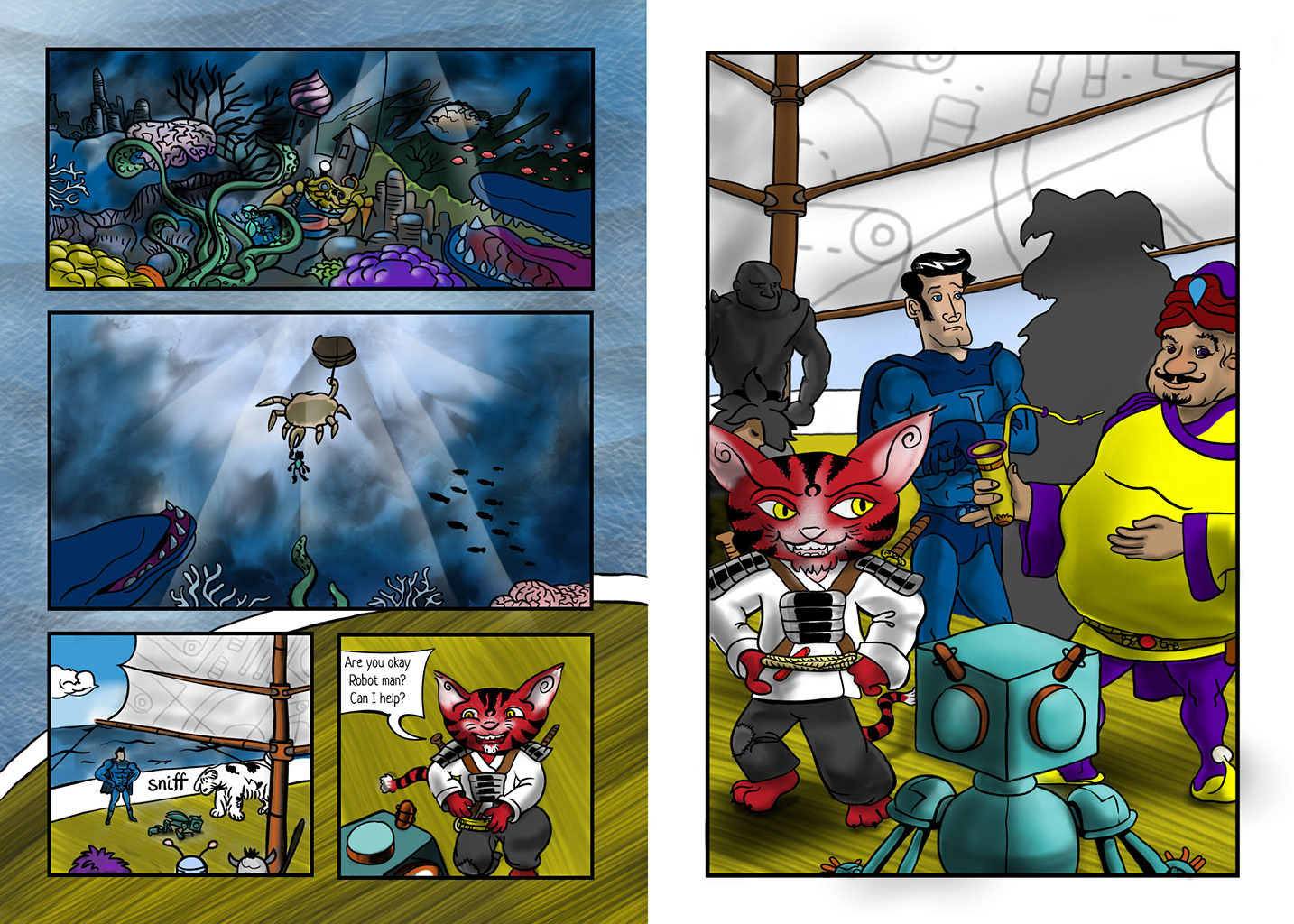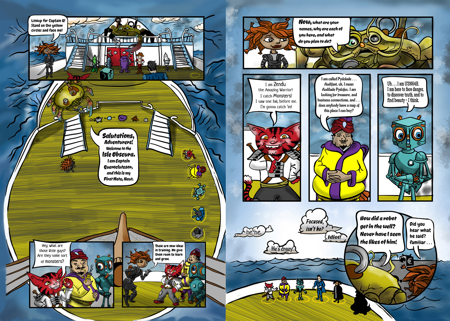 From the beginning I loved the idea of having a bunch of odd adventurers gather on the deck of a ship, and introduce themselves to a huge gold crab. The next page continues on this vein, if you are wondering. I have danced around lately, without landing on plot or characterization, but now it begins. Hope I can improve their communication skills though.