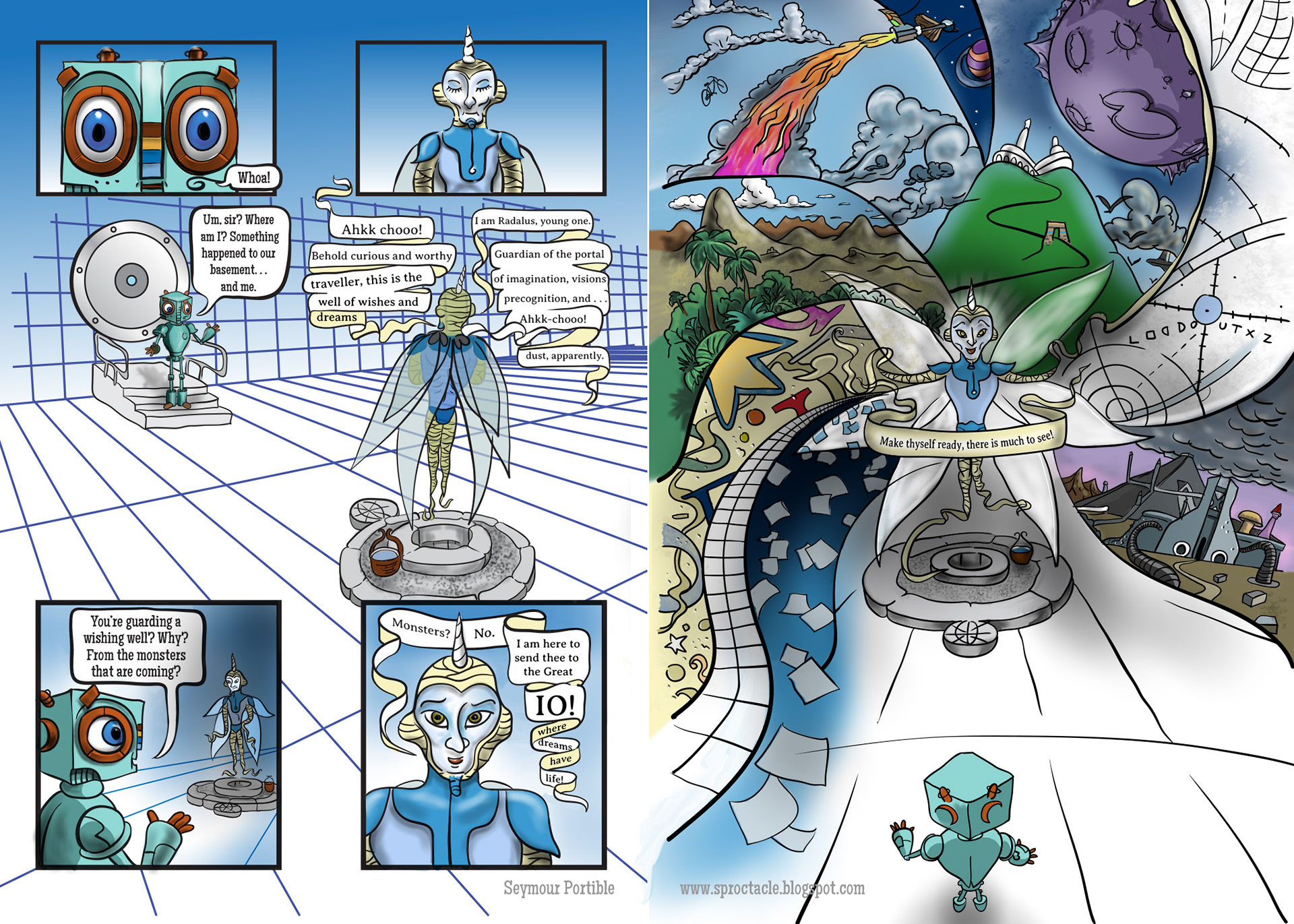 The idea here is that Radalus represents getting a creative vision in your head. He is intangible, and is often forgotten, living in the dust in your head, but he has some amazing powers! Hence the complex imagery, the antique mummy ribbons, and the slightly biblical language. And of course there are strange symbols, such as typography, far off places, a unicorn horn, and a wishing well bucket. That last one plays an important role soon. The color heavy collage was chosen over sketches to kind of look into the future.