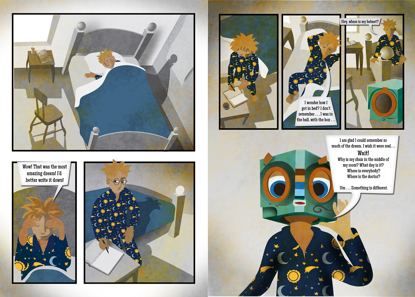 January, 2020. I replaced the main character with drawings of a real boy. Feels so much better. I found that these two pages were smaller, and therefore less resolution and quality. So this is a much needed upgrade, toward possible publishing. . .