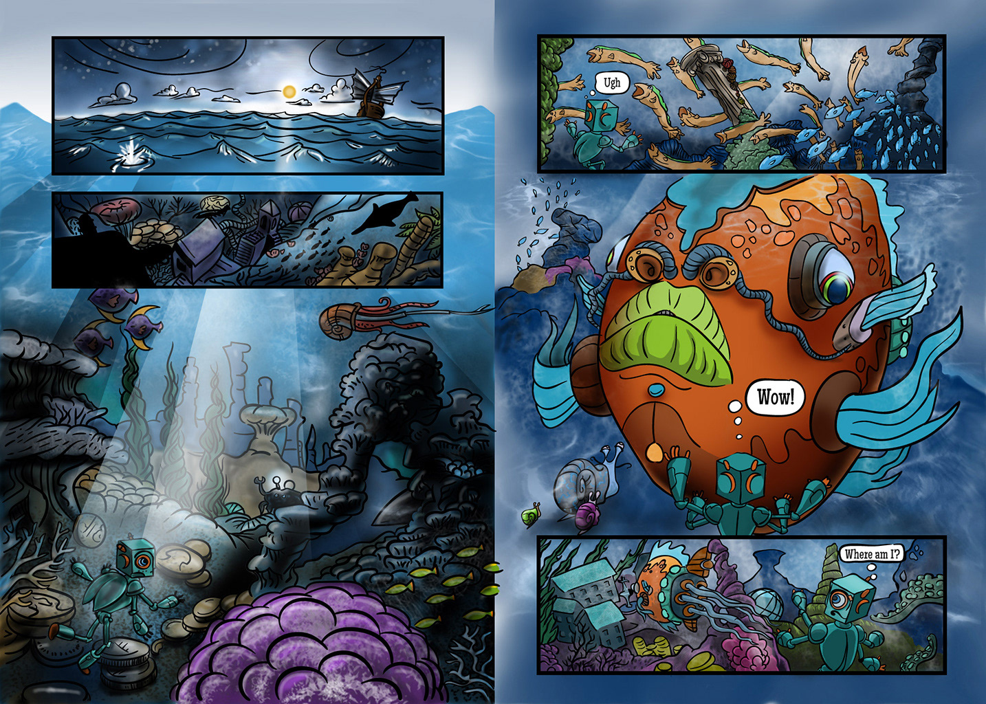 I used to have an aquarium, when I was a kid. I would dream about it, being full of strange plastic toy creatures and strange floating fish with extra arms or fins. I have never been scuba diving, and my real fish were pretty plain, but those were strange dreams, that inspired this panel (drug-free, of course). These dreams made me see things differently, like changing reality for a moment and giving me a different point of view. So alien, and so unexpected, yet my brain made it from the experience of having an aquarium. I had one small shark, and a plecostamus, and a large snail.