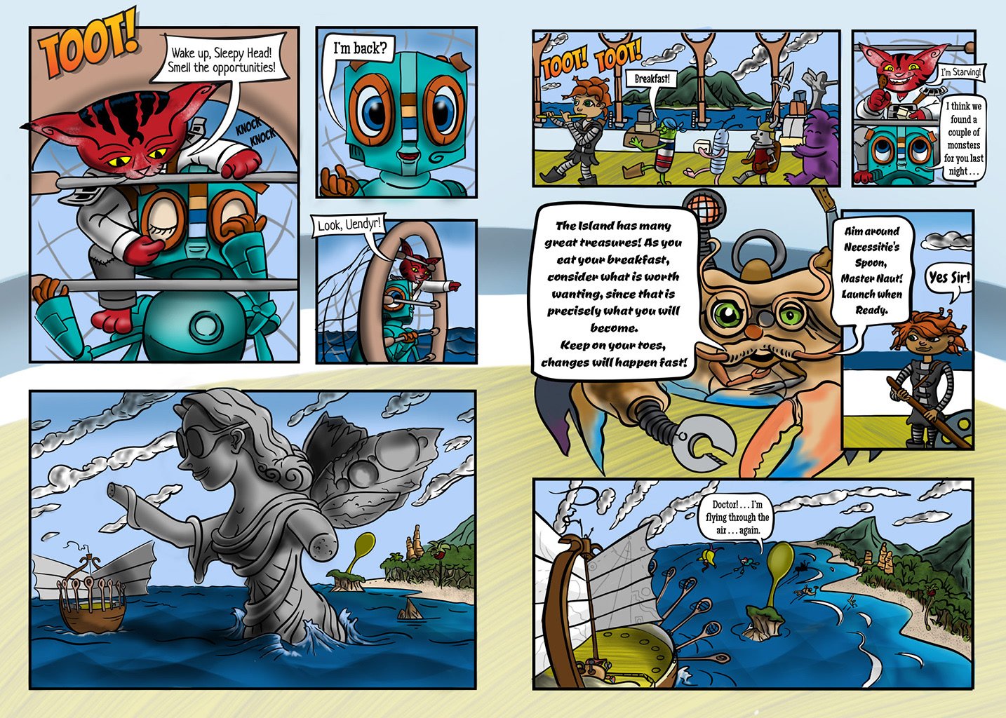 So, what is this spread about? Why does it matter what Radalus says, if Uendyr won’t remember? This is about making the decision to take the leap, even if you do it for the wrong reason. Radalus is just pointing out what a wonderful place the Isle is, and giving Uendyr confidence that he’ll be able to handle it. I realize your imagination doesn’t usually talk to you like a ghost, but vivid visions in your head are what starts your belief that there is potential ahead for something great. I started this online graphic novel because my imagination woke up every time I saw something cool. Then I made a leap by putting it on paper, and my “island” began to appear!