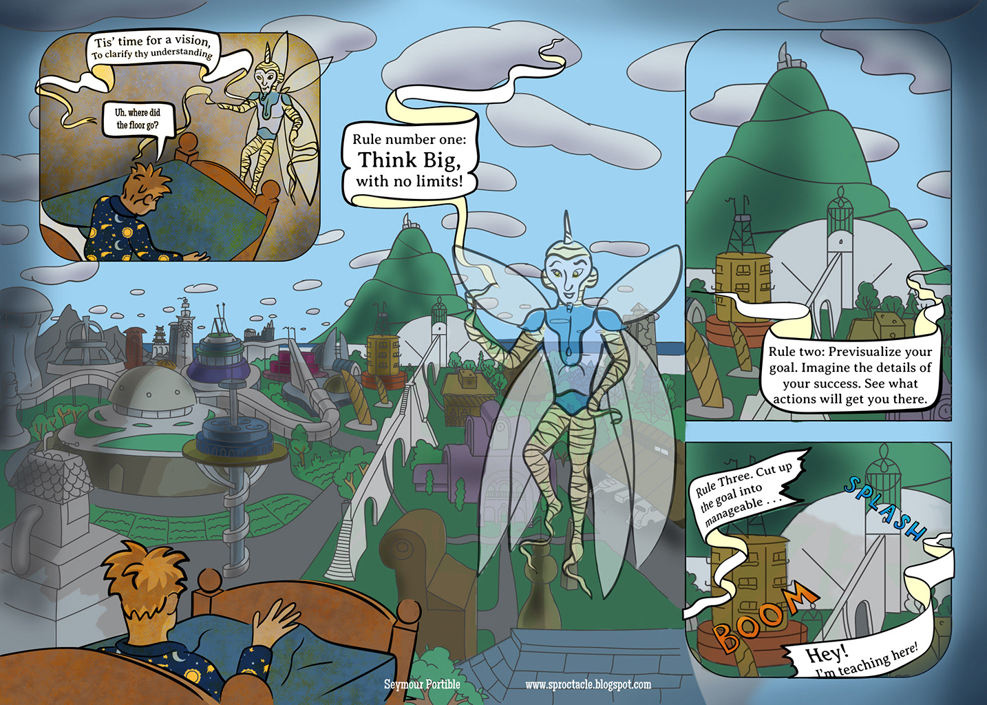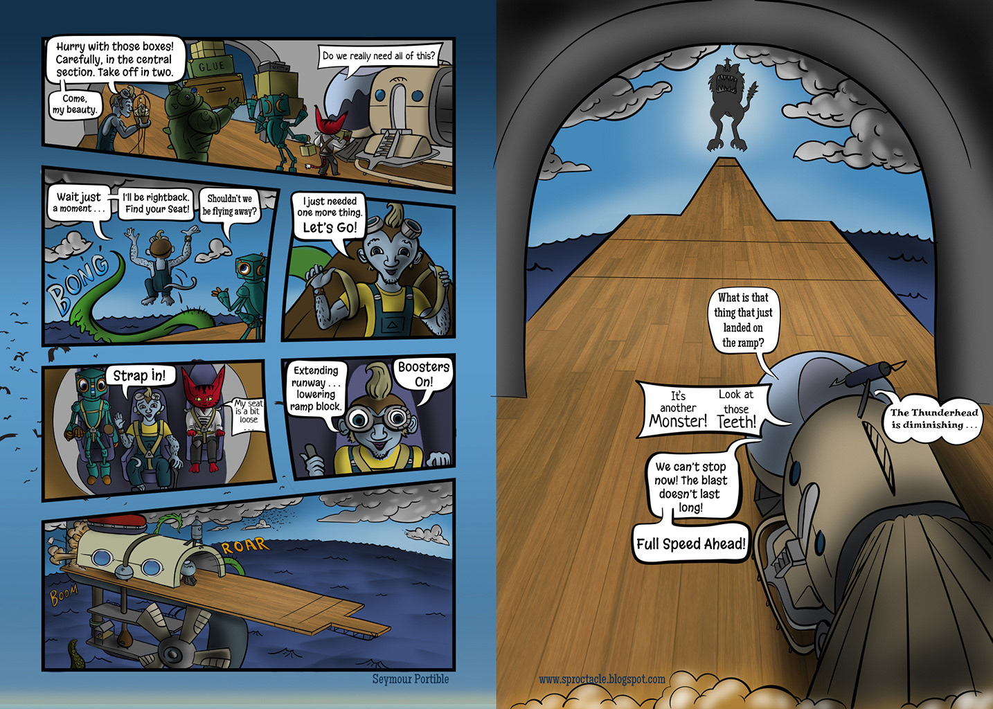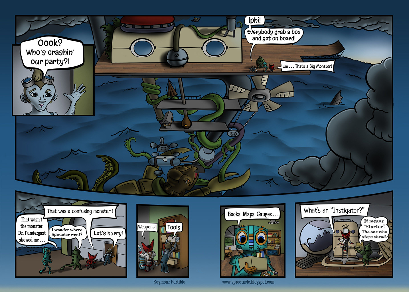 When I started this novel in full color, I had many details for this beginning figured out and written down, but the end chapters are still very hazy, and even though I know what I want to be accomplished, many details have been determined working on the page that contains them. Be open to that, and you will be able to push through the monsters, the fires, the deadlines, the storms, and find the lights in the sky.