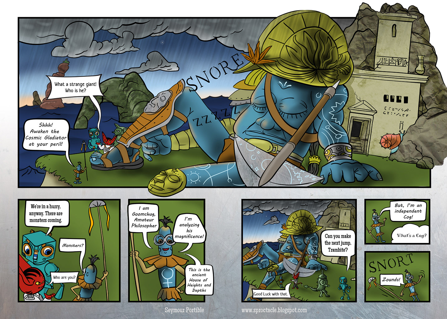 This one had a longer title, but it wouldn't fit: "The Soggy Sands and the Flaming Eye of Scrutiny". They have arrived at their destination, to find danger and confusion and darkness amid the soggy sands of a desert that isn't. As usual, Zendu wants to rush ahead and Trambite wants to hold them back. Lots of contrasts and surprises here, including thorned, huge, fast growing vines.
