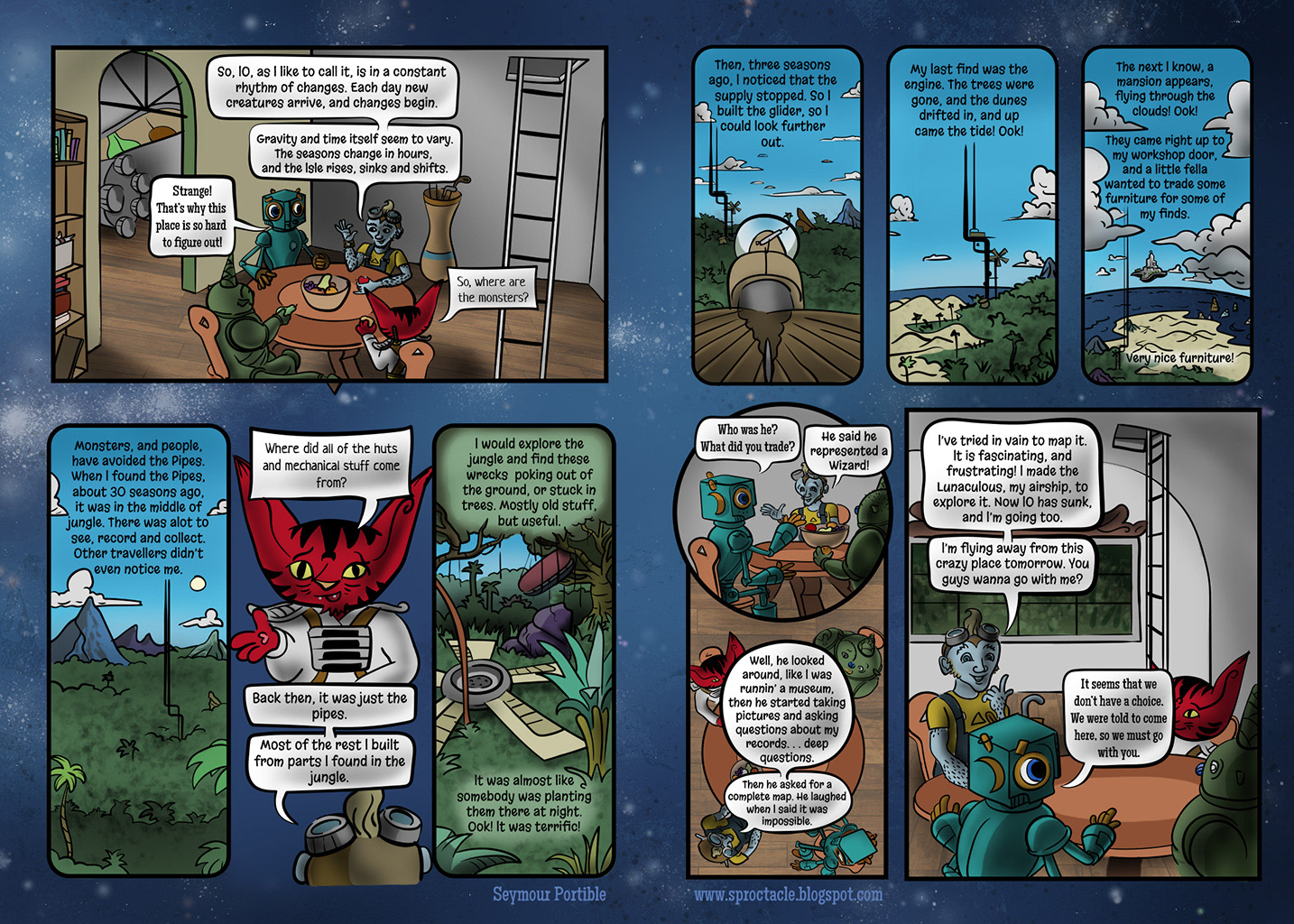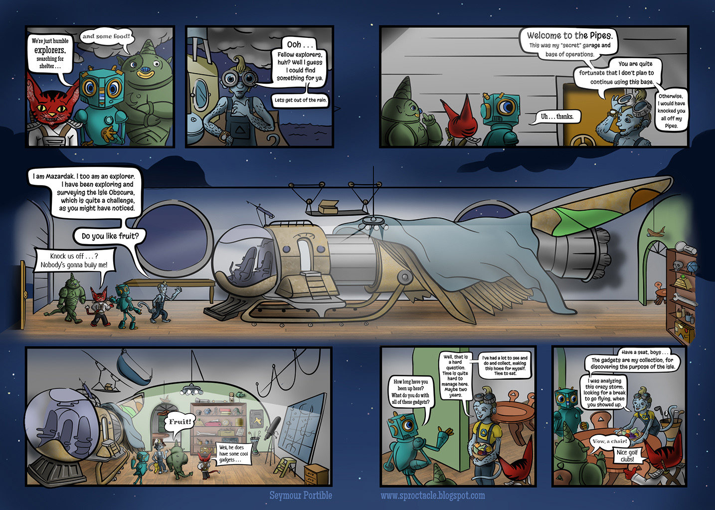 He also recently met another native, in a flying mansion, who apparently has some great furniture to trade. Who is that mysterious character, and what was he looking for? Where did he come from? Is there more island that hasn't sunk, where our travelers can go? The mystery builds as I reveal more of the plan behind this trip to the land of creativity, and the characters who drive it.