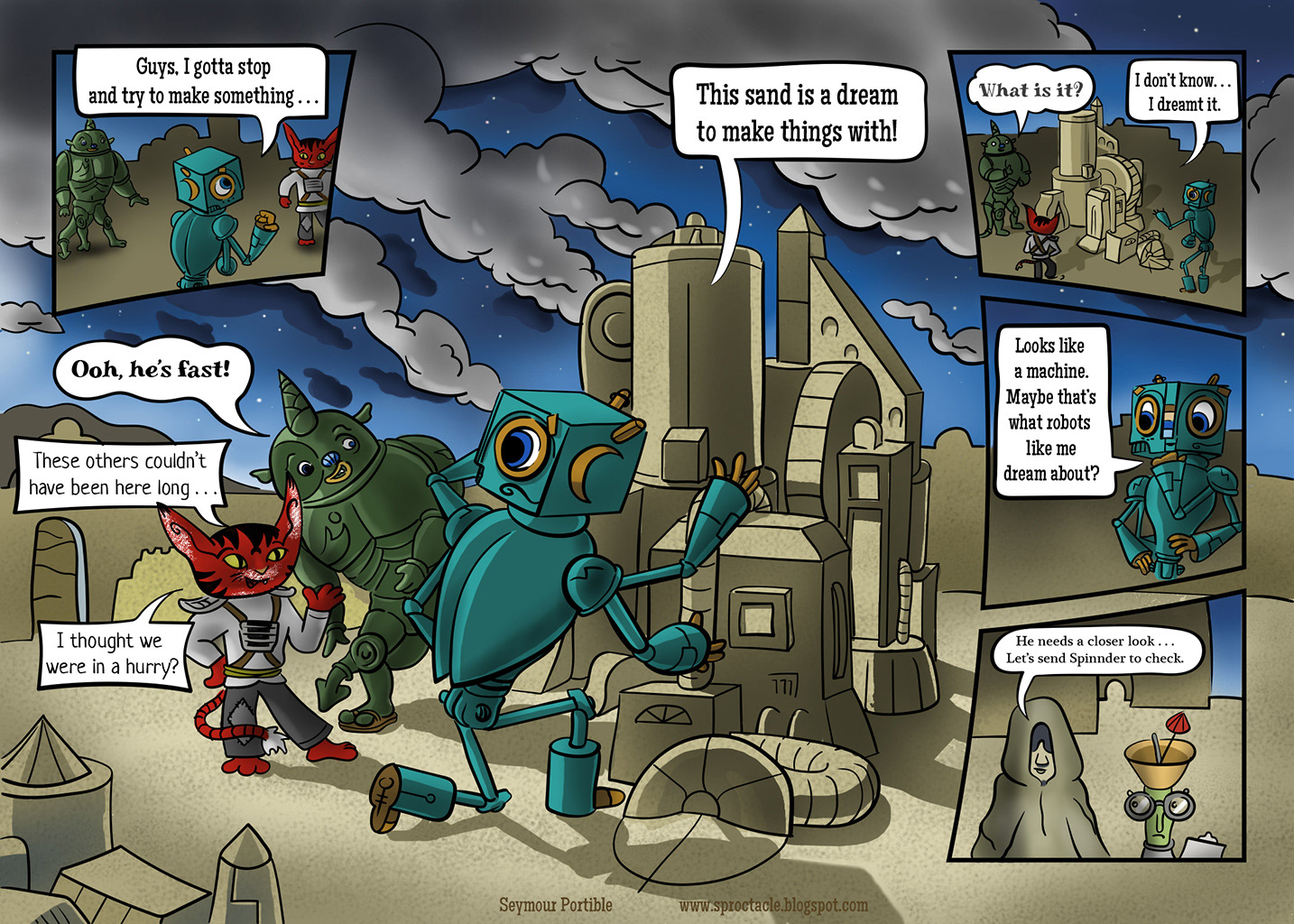 Leaving the Sea of Consciousness behind, our travelers get a chance to see the creative work of some mysterious, possibly small, civilization. It's getting dark, the moon is up and shadows are growing long. The most ephemeral of creations, these sculptures of sand could not have been here long. Uendyr thinks the sandcastles are a possible distraction or lesson, but their creators don't even have our travellers in mind.